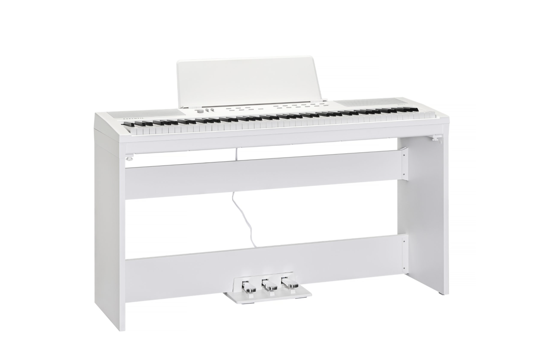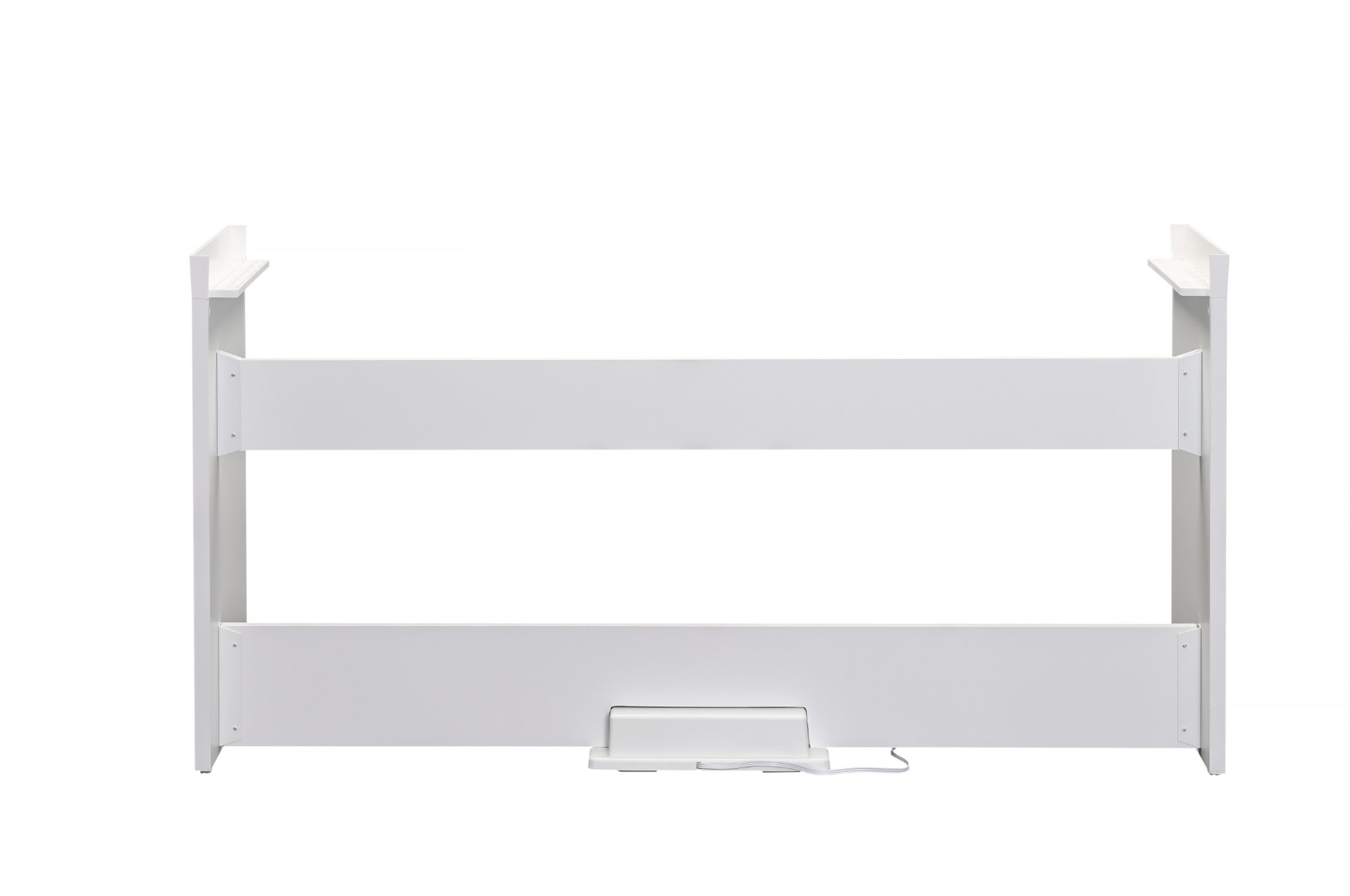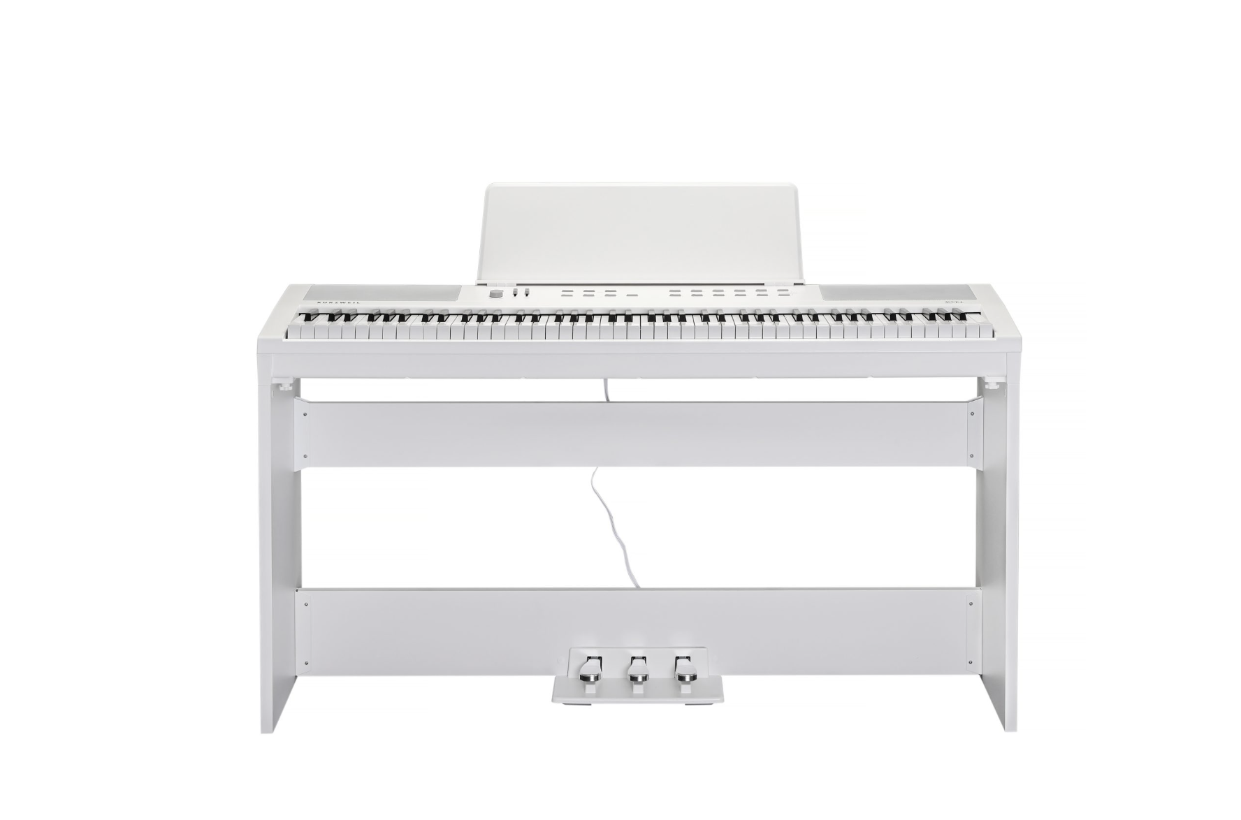 Стійка для портативного цифрового піаніно KA-E1, що оснащена потрійним блоком з класичними рояльними педалями (сустейн, состенуто, софт). Розміри: 131,5(ширина) х 68,5(висота) х 33(глибина), вага: 11 Кг. Колір білий.