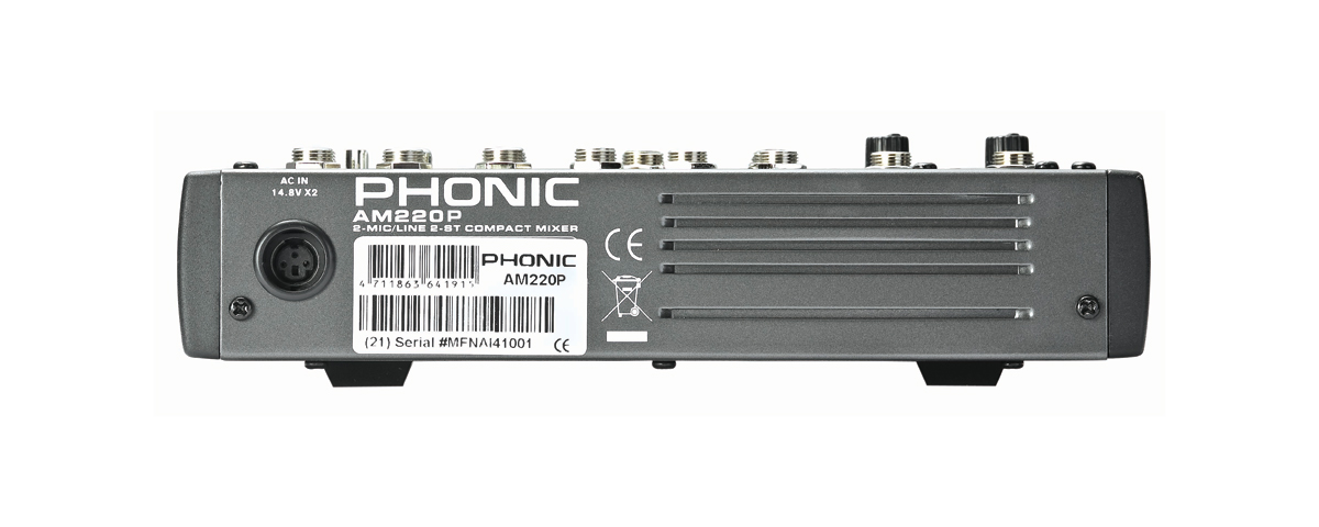 Phonic AM 440 5 292 грн. (немає )Мікшерний пульт, 4 мікр / лін (+48 В, 3-х смуговий еквалайзер, Low Cut 75 Гц) + 4 стерео каналу, MAIN L / R Stereo 1/4 "TRS Jack, 1 AUX Send, стерео EFX / AUX Send, вихід на навушники і монітор CTRL, 3-х смуговий EQ на моновхода, 242 x 55 x 255 мм, 1.7 кг