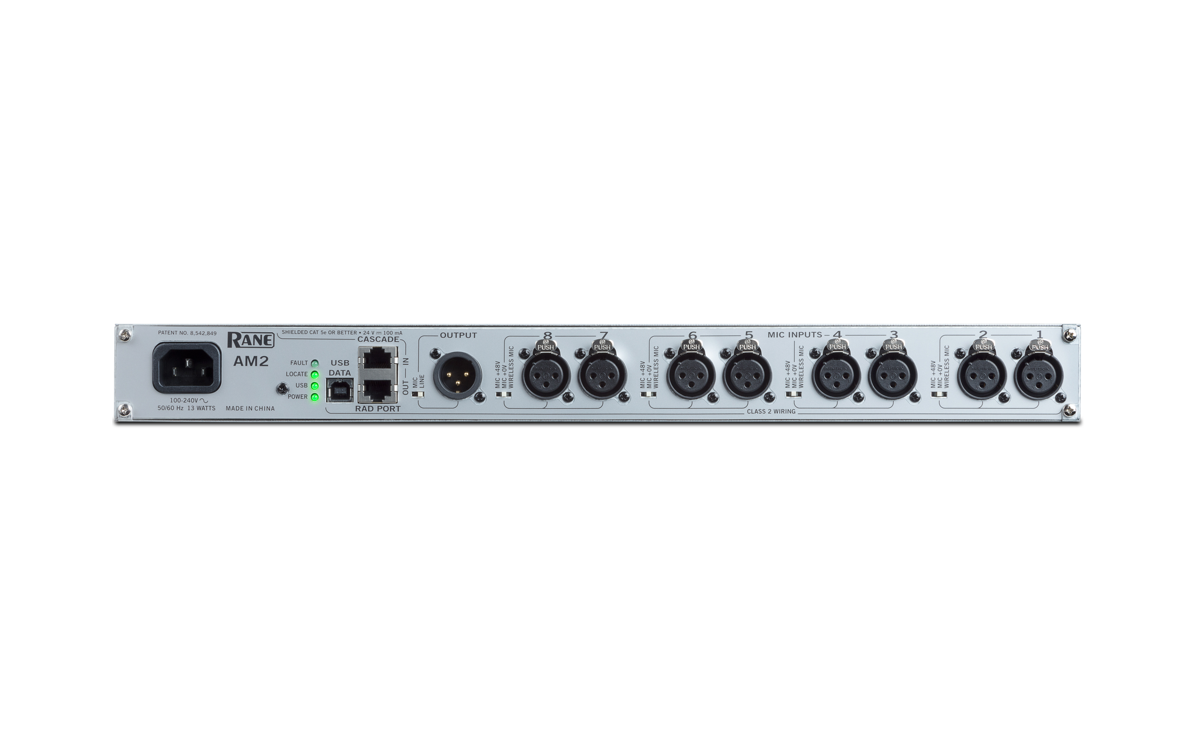 Rane AM2 - це одночасно 8-канальний автоматичний мікшер з розподілом коефіцієнта посилення і одночасно Rane RAD. Використовуйте його як автономний мікшер, призначений лише для мікрофона, додайте більше мікрофонів із розподіленим коефіцієнтом підсилення, використовуючи до семи додаткових AM2 Automixers, та / або використовуйте порт RAD, щоб транспортувати мікрофон до системи HAL Rane.