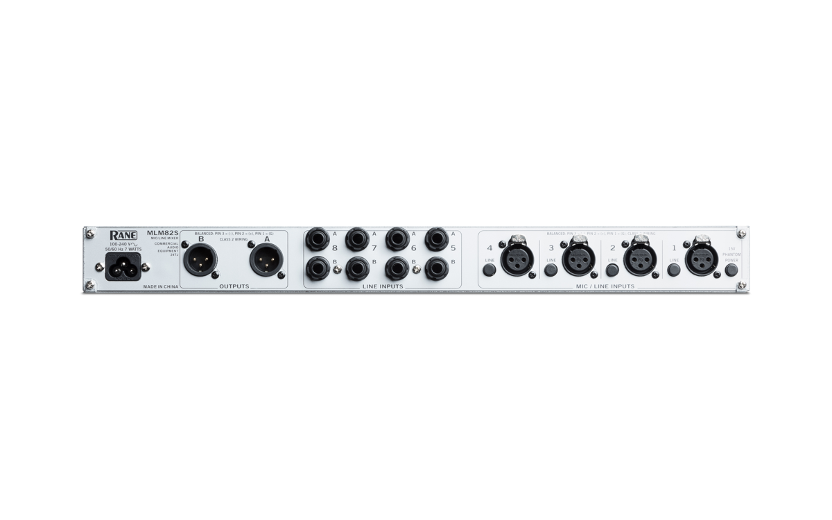 Rane MLM82S оснащений чотирма збалансованими студійними монофонічними / лінійними входами з гніздами XLR та фантомним живленням 15 В постійного струму. Кожен з чотирьох мікрофонних / лінійних входів може бути призначений для виходів A, A + B або B. Для кожного мікрофонного / лінійного входу передбачені незалежні регулятори рівня / посилення та індикатори сигналу / перевантаження. Вимикач Phantom Power та перемикачі Mic / Line розташовані на задній панелі. Фантомне живлення вилучається з будь-якого вхідного набору для роботи лінії.