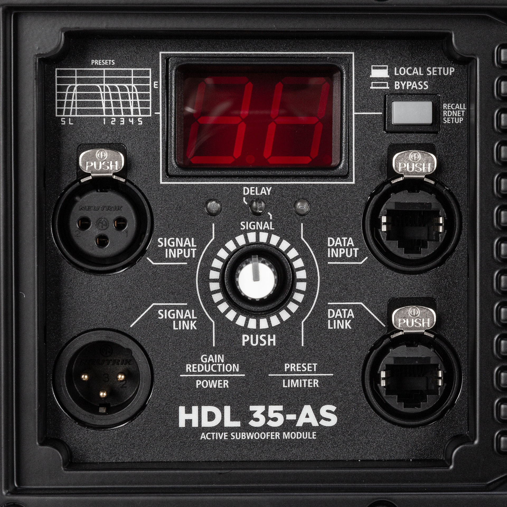 Цифрова активна акустична система HD 35-A. 132 дБ макс. звуковий тиск. Двоканальний підсилювач класу D, 1400 Вт пікова потужність. DSP-обробка із FiRPHASE. В.Ч. - 1,4-дюймовий компресійний титановий драйвер, 3,0-дюймовий неодимовий динамік. Н.Ч. – 15-дюймовий вуфер, висока потужність. Крапка кросовера 800 Гц для ідеального відтворення вокалу. 90 ° x60 °, широкосмуговий рупор постійної спрямованості. Безшумний безвентиляторний підсилювач класу D.