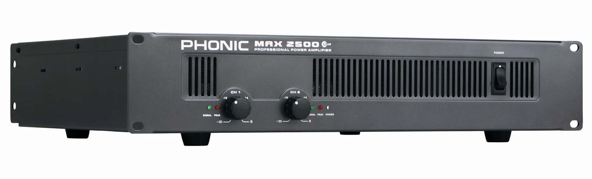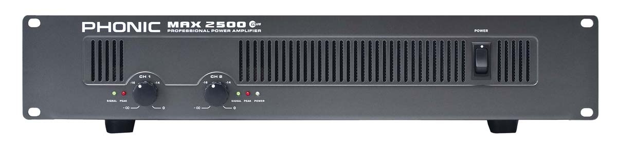 Phonic MAX 1500 PLUS 12 852 грн. (немає) Підсилювач потужності (2U), клас Н, 2 х 280 Вт 8 Ом, 2 х 450 Вт 4 Ом, міст: 900 Вт 8 Ом, (EIA), спотворення менше 0.02%, сигнал / шум 100 дБ, вхід: XLR і Jack , вихід - клеми і Speakon, 482.6 x 88 x 415 мм, 14,6 кг