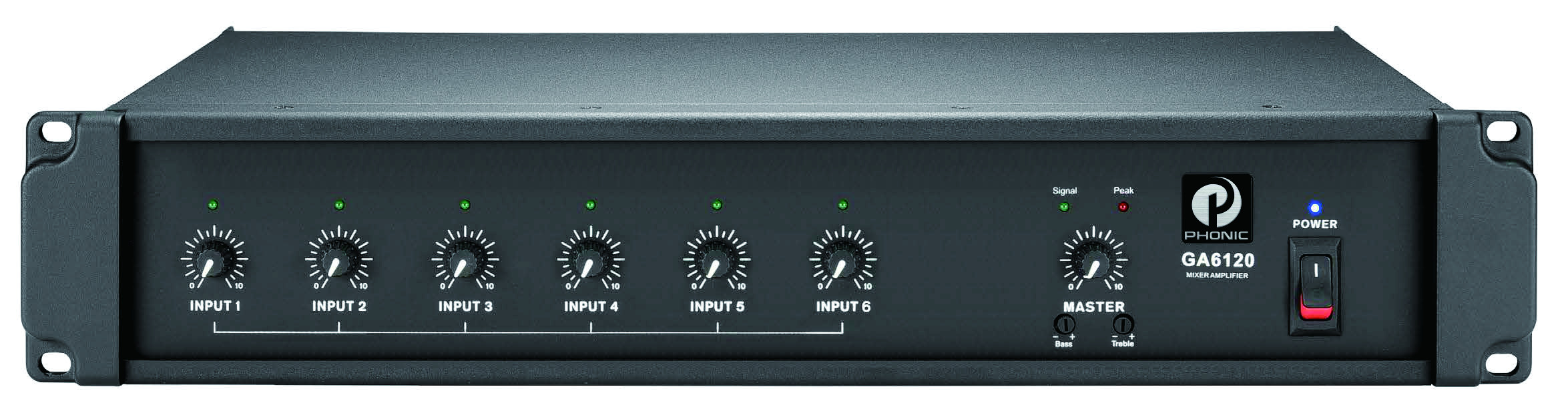 Інсталяційний мікшер-підсилювач, 120 Вт RMS х 8Ом / 100В. 1 euroblock, 1 XLR, 3 RCA/Jack TS,1 RCA/miniJack входи. 2 смуговий EQ, сирена, клавіша мовлення мікрофона. Підключення акумулятора 24V DC з можливістю його підзарядки.