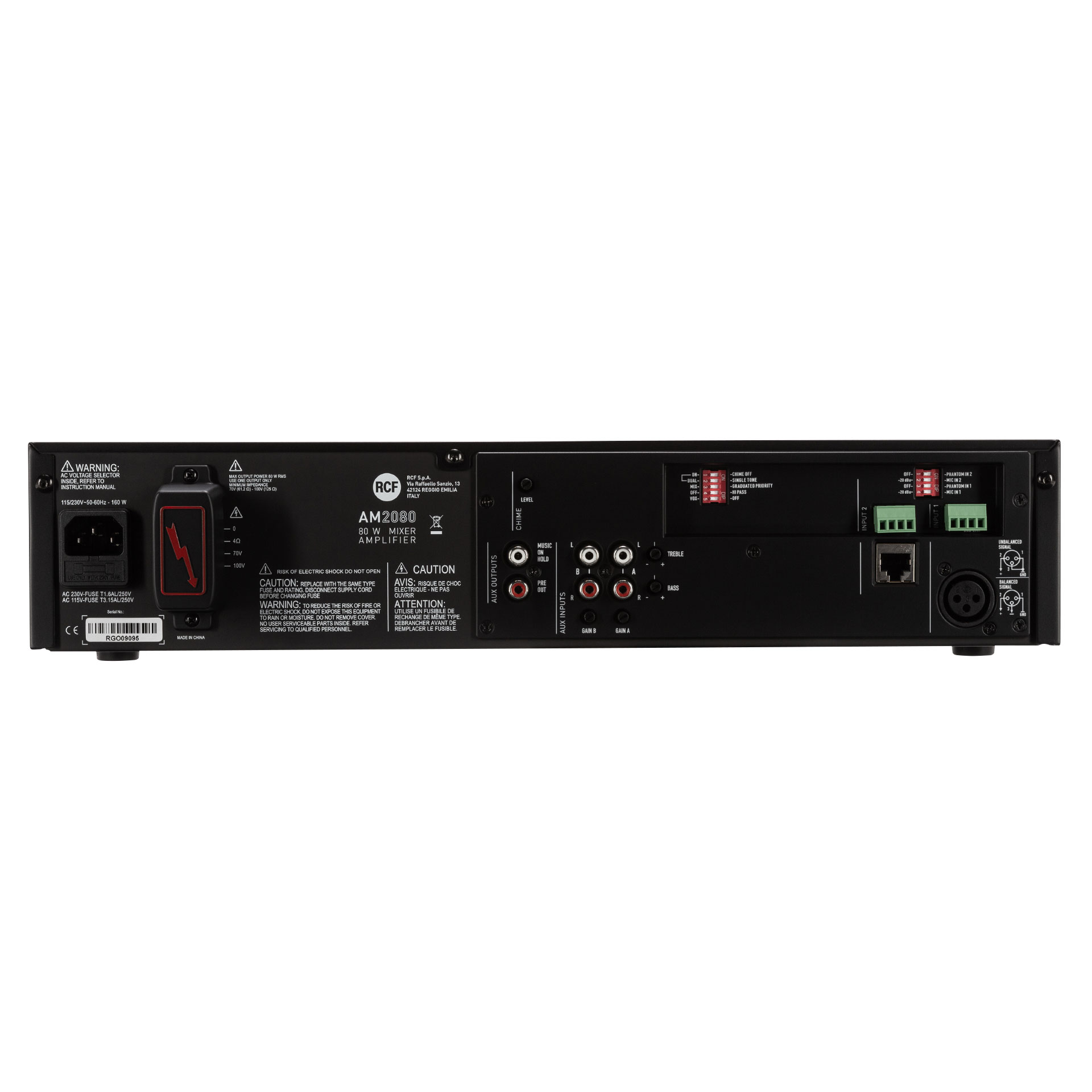 Активний інсталяційний мікшерний підсилювач 19" 2U, 80 Вт. 2 мікрофонно-лінійних входи на знімних роз’ємах (перший вхід також має XLR роз’єм) та 2 AUX входи для музичних джерел. Вихід для низькоомних динаміків (мін. 4 Ом) або 70/100 В лінії. 50 Гц - 16 кГц, колір - чорний. Підтримка VOX функції на вході 1, фантомне живлення, конфігуровані налаштування пріоритету, вбудований генератор цифрового сигналу та сирени, музика на утриманні та вихід PRE. Рекове кріплення в комплекті.