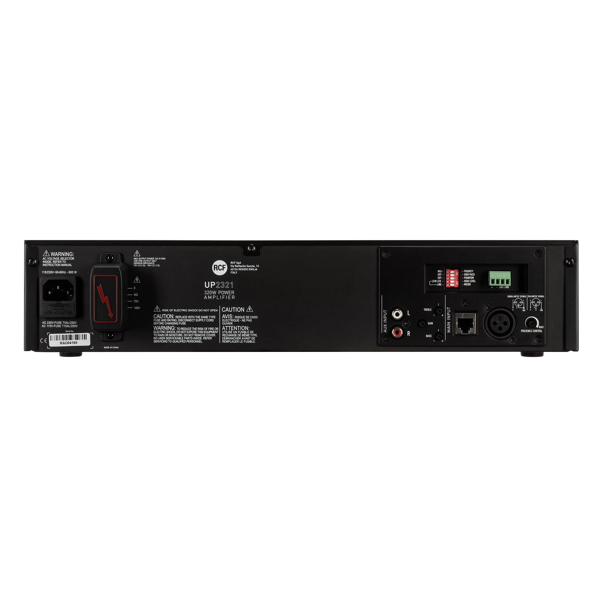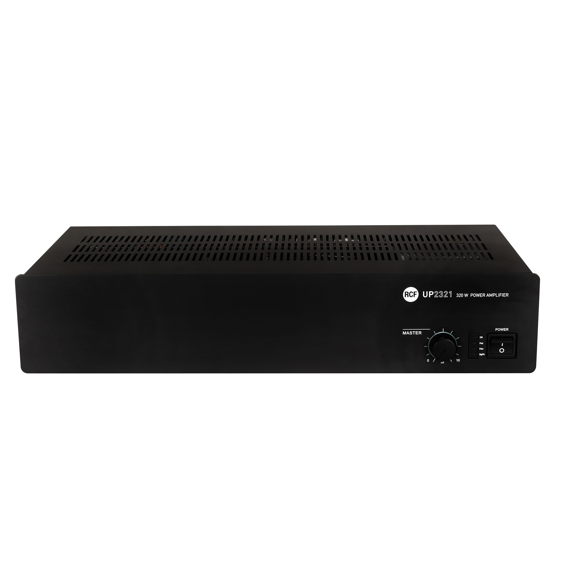 Активний інсталяційний підсилювач 19" 2U, 320 Вт. Основний вхід на знімному роз’ємі, XLR або RJ 45, з можливістю пріоритету над AUX входом. Основний вхід має команду контролю присутності та високочастотний фільтр для покращення розбірливості мови. AUX вхід для музичних джерел на RCA роз’ємі з регулюванням гучності та тону. Виходи для низькоомних динаміків (мін. 4 Ом) або 70/100 В лінії. Підсилювач класу D з імпульсним джерелом живлення. Частотний діапазон: 50 Гц - 14 кГц. Колір - чорний.