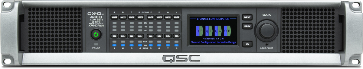 Підсилювач потужності восьмиканальний (2U), гнучкий поканальний розподіл номінальної потужності, сумарно до 4000 Вт, режими bridged A + B / C + D / E + F / G + H, parallel AB / CD / EF / GH, parallel ABC / EFG, combined bridged / parallel AB + CD и EF + GH, parallel ABCD / EFGH, незалежний вибір типу вихідного навантаження каналу підсілювача (4 Ом, 8 Ом, 70 В, 100 В), входи: 4 x 3-pin 3,5 мм Phoenix роз'єми MIC / LINE (помаранчевий), 8 x GPIO для віддаленого управління, вихід: 2 х роз'єма Euro Phoenix (зелений), клас D, захист вихідних каскадів, 11.8 кг, Q-LAN інтерфейс. Працює только з системою Q-SYS