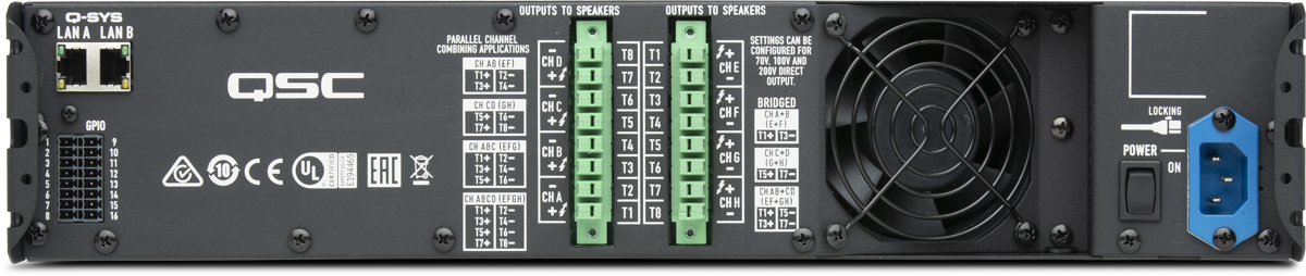 Підсилювач потужності восьмиканальний (2U), гнучкий поканальний розподіл номінальної потужності, сумарно до 4000 Вт, режими bridged A + B / C + D / E + F / G + H, parallel AB / CD / EF / GH, parallel ABC / EFG, combined bridged / parallel AB + CD и EF + GH, parallel ABCD / EFGH, незалежний вибір типу вихідного навантаження каналу підсілювача (4 Ом, 8 Ом, 70 В, 100 В), входи: 4 x 3-pin 3,5 мм Phoenix роз'єми MIC / LINE (помаранчевий), 8 x GPIO для віддаленого управління, вихід: 2 х роз'єма Euro Phoenix (зелений), клас D, захист вихідних каскадів, 11.8 кг, Q-LAN інтерфейс. Працює только з системою Q-SYS