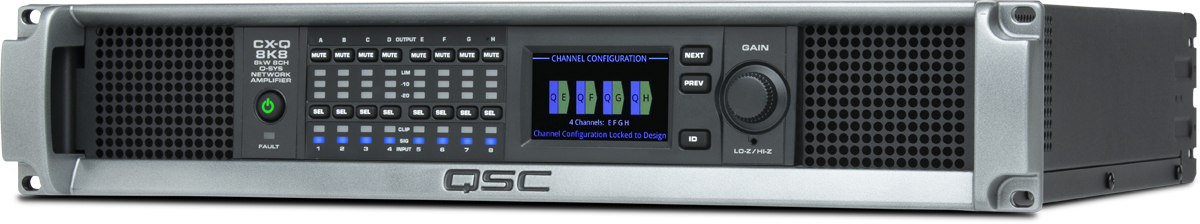 Підсилювач потужності восьмиканальний (2U), гнучкий поканальний розподіл номінальної потужності, сумарно до 8000 Вт, режими bridged A + B / C + D / E + F / G + H, parallel AB / CD / EF / GH, parallel ABC / EFG, combined bridged / parallel AB + CD и EF + GH, parallel ABCD / EFGH, незалежний вибір типу вихідного навантаження каналу підсілювача (4 Ом, 8 Ом, 70 В, 100 В), входи: 4 x 3-pin 3,5 мм Phoenix роз'єми MIC / LINE (помаранчевий), 8 x GPIO для віддаленого управління, вихід: 2 х роз'єма Euro Phoenix (зелений), клас D, захист вихідних каскадів, 11.8 кг, Q-LAN інтерфейс. Працює только з системою Q-SYS
