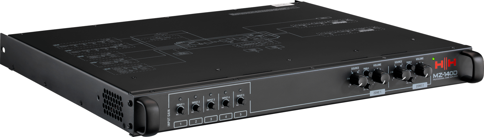 2-зонний інсталяційний мікшер-підсилювач, 2*140 Вт RMS Class D х 70 В/4 Ом, 100 В/8 Ом (налаштовується для кожної зони), Zone 1 балансний вихід Line Out, входи CH 1/2 - балансні комбо MIC (XLR, +48В, обрізні фільтри НЧ 120 Гц)/LINE (Jack 6,3 мм), CH 3/4 - балансні L&R (Euroblock 3,5 мм), CH 5 - стерео AUX (Jack 3,5 мм / стерео RCA). Незалежне регулювання еквалайзером НЧ і ВЧ в кожній зоні. Індикація вхідного та вихідного рівнів та перевантаження сигналу. Функція Output Limiter, Priority Ducking, Emergency Override (для сигналу аварійного оповіщення), Перемикач блокування органів управління передньої панелі. Дистанційне керування гучністю та вибору вхідного джерела (за допомогою модуля HH MZ-C2, підключається кабелем Ethernet, daisy chain). Живлення від мережі 100-240 В. Висота 1U. Набір для монтажу в стійку в комплекті.