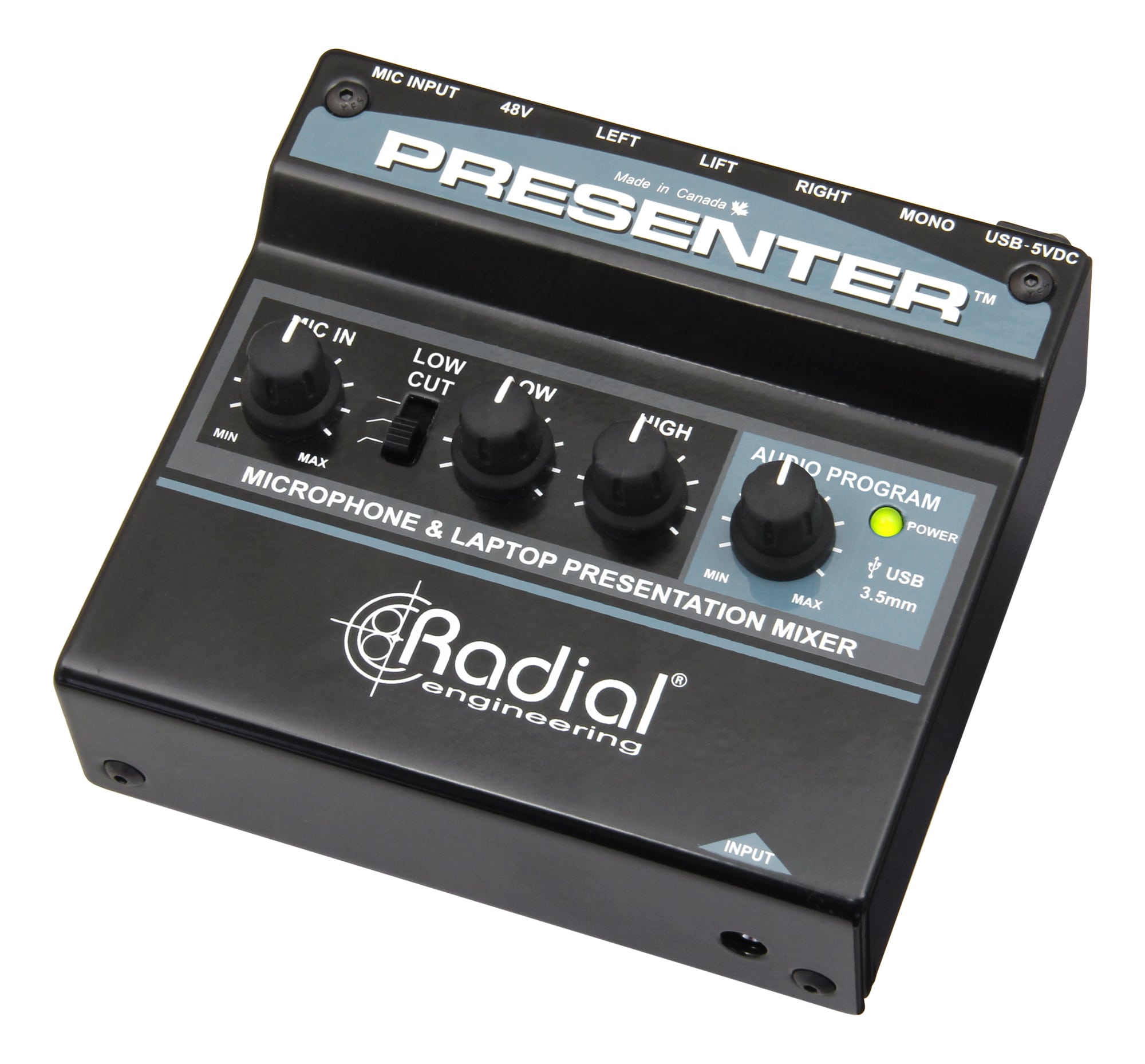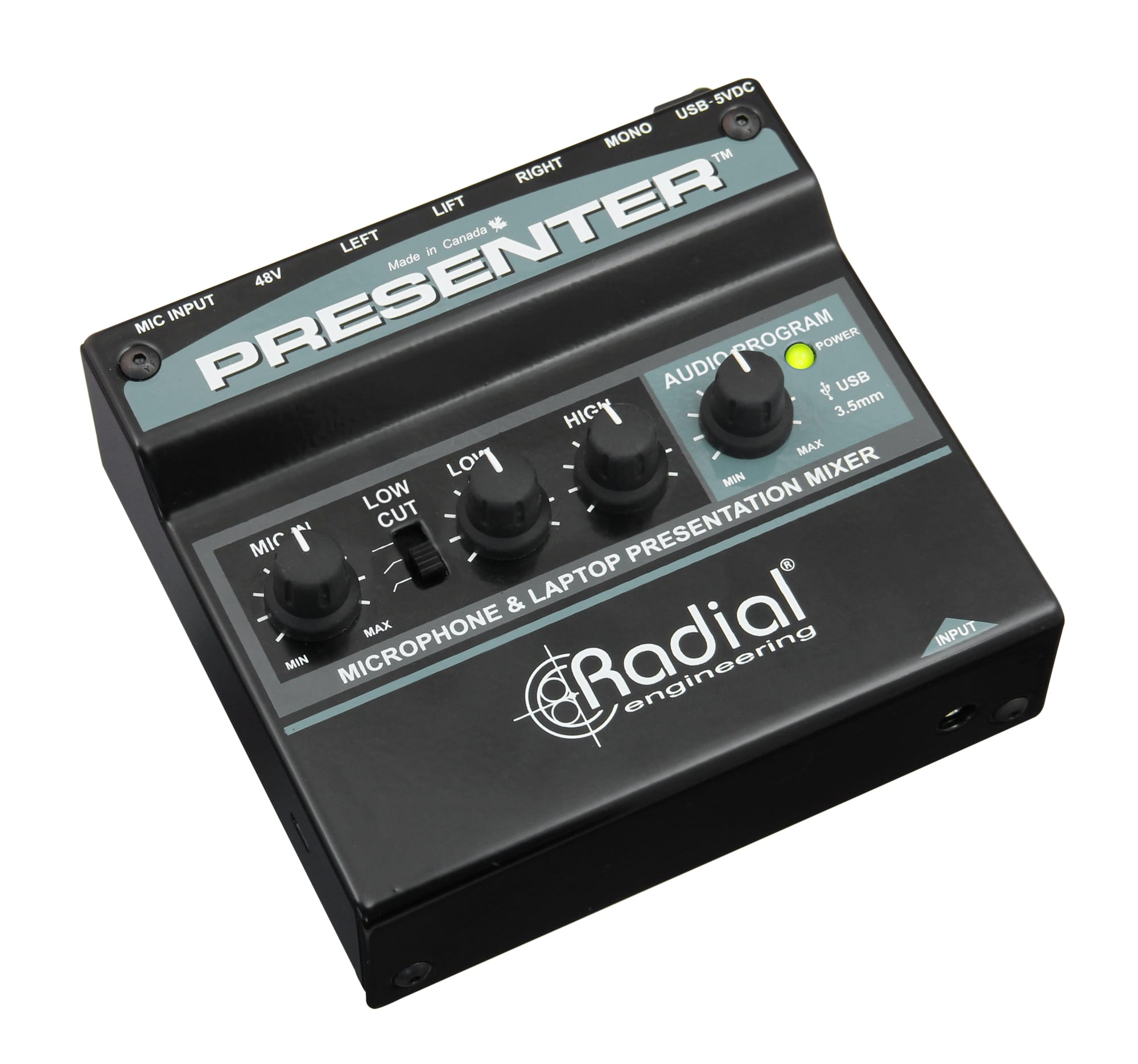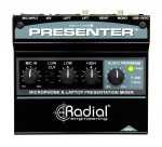 Radial MIX 2:1 10 080 грн. (немає) Пасивний двоканальний мікшер, дозволяє з’єднувати два аудіосигнали в один моно-канал, не потребує живлення, має входи 1/4" TRS та XLR, моно-вихід XLR, індивідуальні регулятори рівня для кожного входу, перемикачі фази та ground lift, можливість обходу регуляторів гучності, частотна характеристика 20 Гц – 20 кГц, рівень шуму -113 дБ, динамічний діапазон >133 дБ, максимальний вхідний рівень >+20 дБ, вхідний імпеданс 8 кОм, вихідний імпеданс 1 кОм, розміри 127 x 84 x 45 мм, вага 0,54 кг.