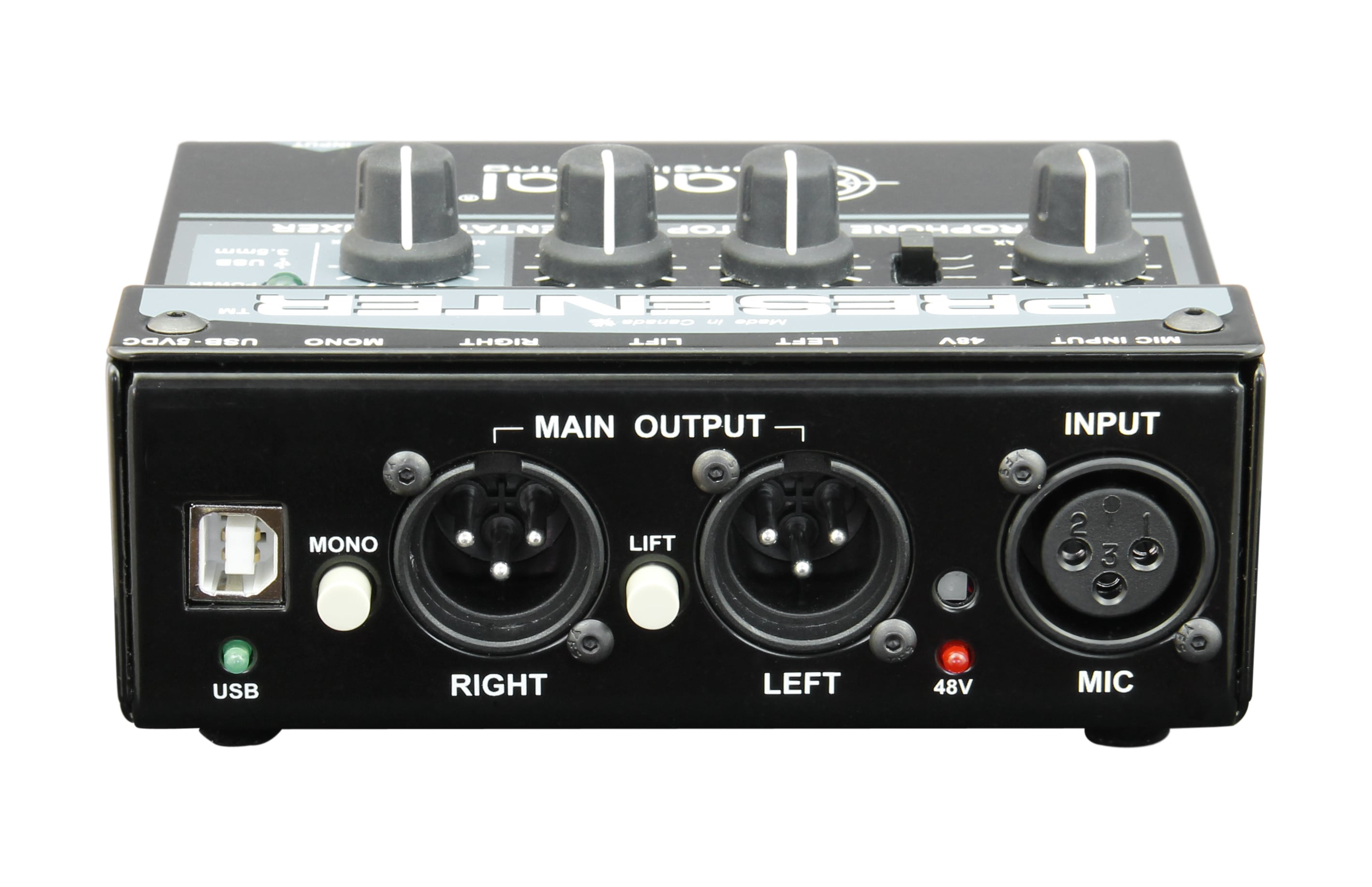 Компактний мікшер з USB-інтерфейсом, має XLR-вхід з фантомним живленням 48 В, регулятори низьких та високих частот, фільтр низьких частот, трипозиційний перемикач для зменшення низькочастотного шуму, USB-роз'єм типу B для підключення ноутбуків і 3,5 мм стерео-роз'єм для мобільних пристроїв, стерео XLR-виходи для звукових систем, кнопку моно для об'єднання каналів, перемикач Ground lift для усунення шумів, живлення через USB або окремий адаптер, частотна характеристика 20 Гц – 20 кГц, динамічний діапазон +91 дБ, максимальний вхідний рівень +7 дБ, вхідний імпеданс 10 кОм, вихідний імпеданс 2,74 кОм, розміри 180 x 120 x 45 мм, вага 0,65 кг.