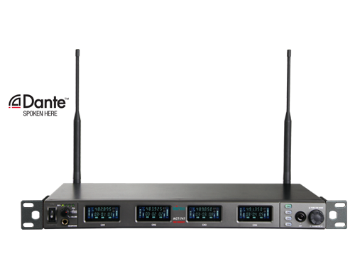 UHF чотирьохканальна радіосистема: приймач розмір 1U река, Диверситивний прийом, VFD екран, виходи XLR / JACK, метал. корпус. Підтримка Dante протоколу.
