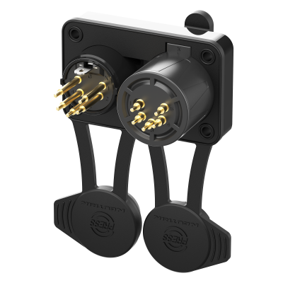 Панельний роз'єм XLR комбінований "мама" + "тато" 5-контактний з замком та кришкою. TOP (TRUE OUTDOOR PROTECTION), IP65, UL94 V-0, робочі температури -30 °C...+80 °C, фланець типу "D", фронтальний монтаж. Контакти з золотим напилення для пайки. Міцний литий корпус з чорним покриттям (ударостійкий, вогнестійкий, стійкий до ультрафіолету). Повна повітронепроникність. В упаковці 100 шт.