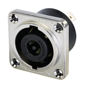 speakON - 8-контактний панельний роз'єм "тато" із замком, на роз'ємі встановлені клеми MDD 1/4" (сумісні з кабельними обтискними клемами FDFD), зенкеровані наскрізні отвори для кріплення, сірий металевий корпус, посадочний діаметр ≥31 мм (тип G), захищений від вологи. Роз'єм повністю відповідає стандарту IEC 62368-1, завдяки сертифікації компонентів відповідно до IEC 61984.