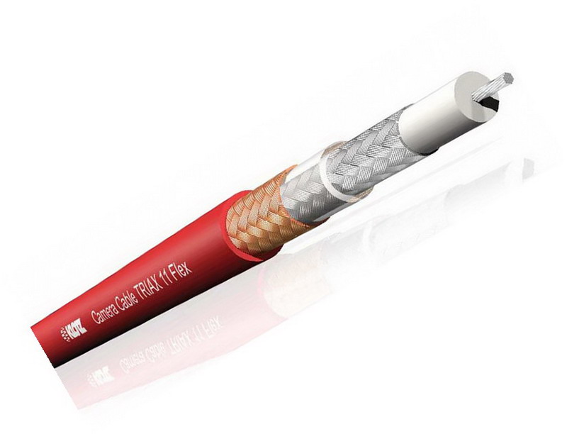 Триаксіальний гнучкий кабель для відеокамер; (багатожильний посріблений провідник 19 x 0,28), ізоляція: спінений PE, Ø 6,0 мм, PUR, подвійний екран - мідна оплетка + посріблена мідна оплетка, зовнішній діаметр 11 мм, колір червоний. Затухання [дБ / 100м]: 1 МГц: 0,5; 5 МГц: 1,3; 10 МГц: 1,8; 20 МГц: 2,6; 50 МГц: 4,5; 100 МГц: 6,7.