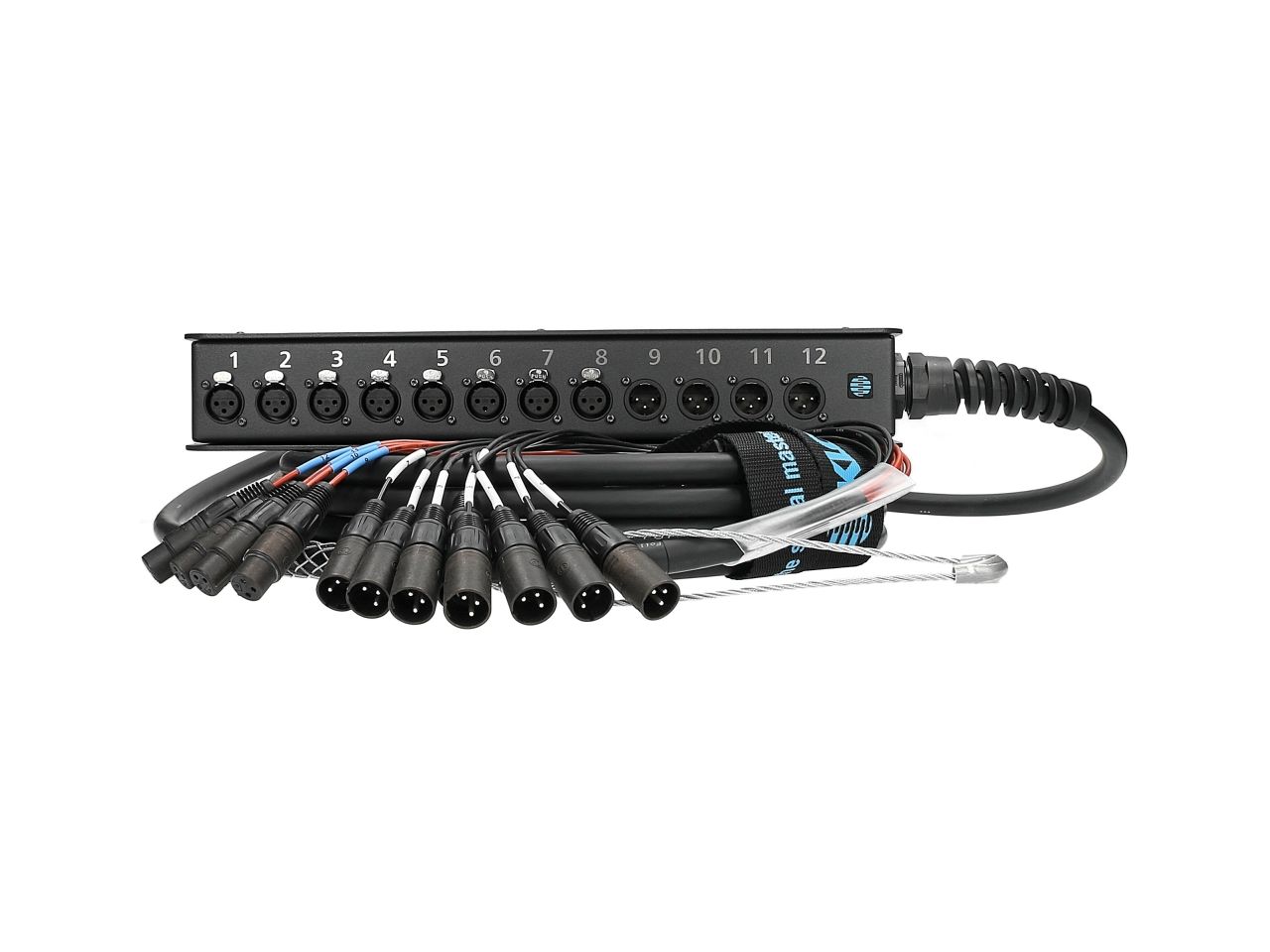 Мультикор 8/4, довжина - 5 м. Роз'єми на кабелі - 4 x XLR-"мама", 8 x XLR-"тато"; панельні роз'єми - 8 x XLR-"мама", 4 x XLR-"тато", алюмінієва коробка (стейджбокс, розміри (ДxШxВ): 384x61x64,5 мм). Гнучкий студійний мультикорний кабель PW..X із перетином провідників Ø 0,22 мм², XLPE. Для сценічного / студійного використання.