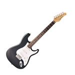 Електрогітара типу Strat, цілісний корпус, гриф - клен з палісандровою накладкою, 3 датчика типу сингл, 5-позиційний перемикач, тремоло, білий пікгард, колір чорний.