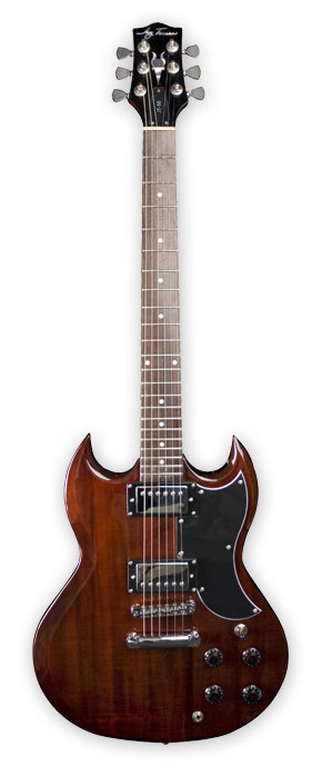 Електрогітара SG-подібної форми. Цілісна дека з кленовим вклеєним грифом. Палісандрова накладка. 2 хамбакера. Лита механіка. Колір червонувато-коричневий під лаком.
