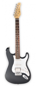 Електрогітара типу Strat, цілісний корпус, гриф - клен з палісандровою накладкою, 2 датчика типу сингл, хамбакер в бриджі, 5-позиційний перемикач, тремоло, білий пікгард, колір чорний.