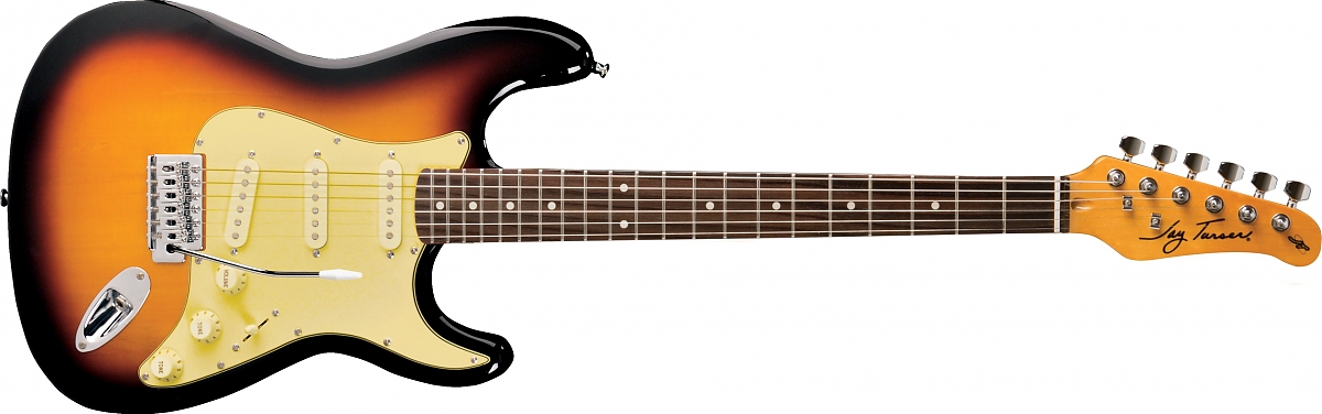 Електрогітара типу Strat, серії "Vintage", цілісний корпус, гриф - клен з палісандровою накладкою, 3 датчика типу сингл, 5-позиційний перемикач, тремоло, білий пікгард, колір санберст.