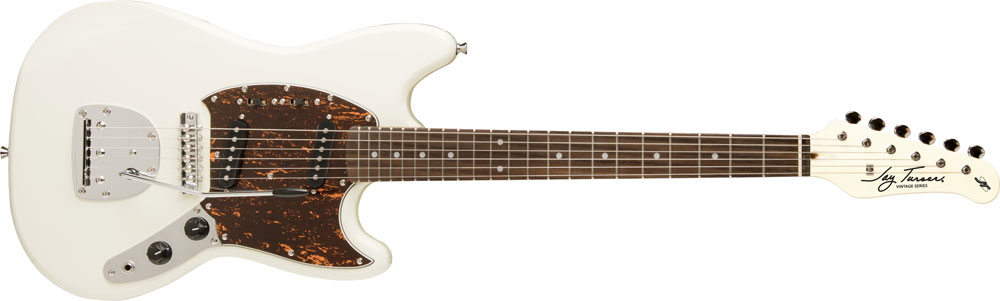 Гітара форми "Mustang". Цілісна дека, кленовий гриф з палісандровою накладкою. 2 сингли, бридж з тремоло. Колір білий.
