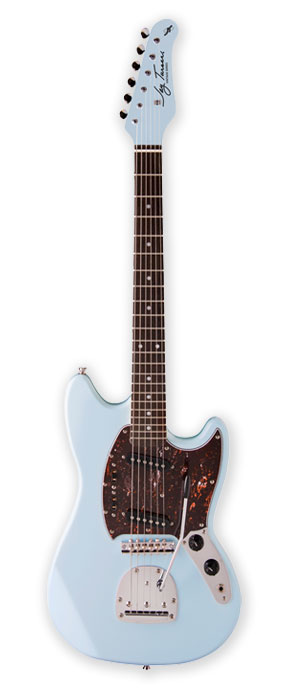 Гітара форми "Mustang". Цілісна дека, кленовий гриф з палісандровою накладкою. 2 сингли, бридж з тремоло. Колір блакитний.