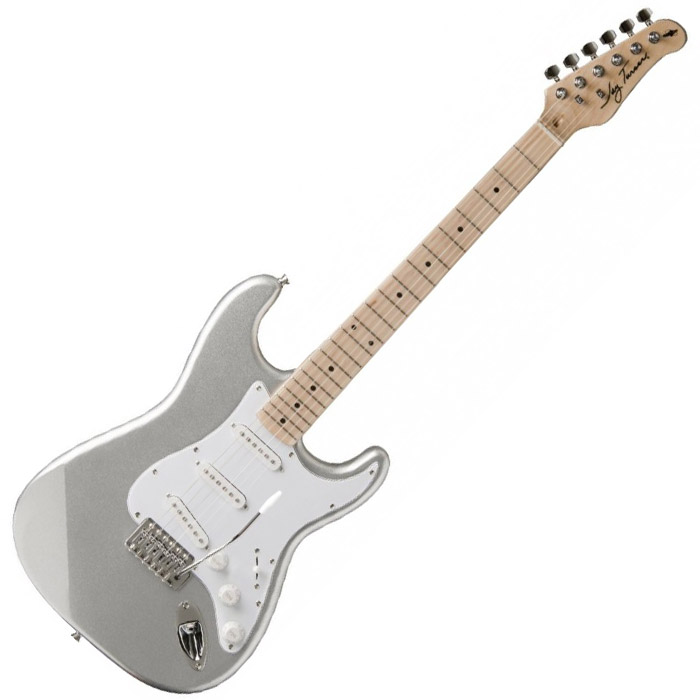Електрогітара типу Strat, цілісний корпус, гриф - клен з палісандровою накладкою, 3 датчика типу сингл, 5-позиційний перемикач, тремоло, білий пікгард, колір срібло-хром.