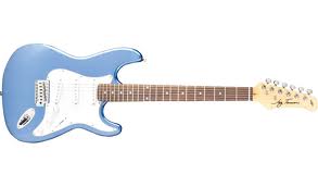 Електрогітара типу Strat, цілісний корпус, гриф - клен з палісандровою накладкою, 3 датчика типу сингл, 5-позиційний перемикач, тремоло, білий пікгард, колір блакитний металік.