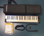 Професійний Мелодіон альт. 44 клавіші, діапазон: C-G3. Бронзові пластини, язички з фосфорної бронзи, вбудований динамічний мікрофон, вихід типу jack 1,4 ", регулятор гучності. В комплекті короткий мундштук MP-141, гнучка трубка, мундштук з трубкою і L-подібним наконечником, полірувальна тканина, м'який чохол. Розміри : 56,3 x 10,6 x 5,2 см. Вага: 1,2 кг.