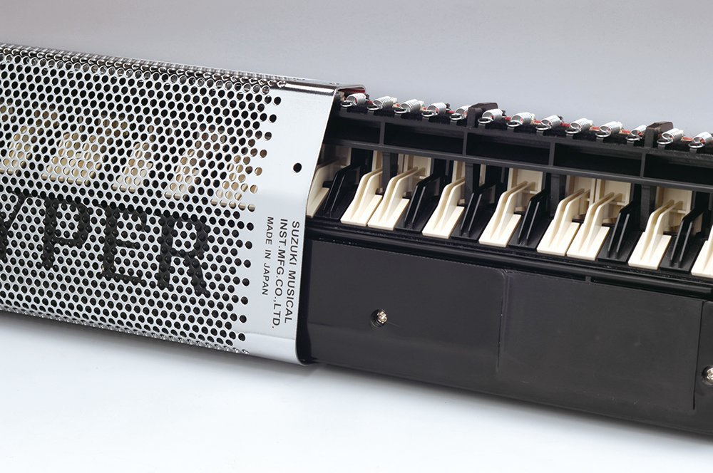 Професійний Мелодіон Hammond 44 Hyper. 44 клавіші, діапазон: C1-G3, встроенній динамічний мікрофон, язички з фосфорної бронзи, регулятор гучності, перфорований корпус. У комплекті короткий мундштук, гнучка трубка, мундштук з трубкою і L-подібним наконечником, полірувальна тканина, м'який чохол. Розміри: 56 x 13,3 x 5 см. Вага: 1,2 кг.