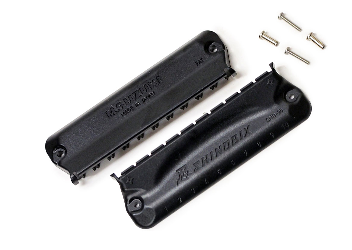 Кришки глушника для гармоніки Suzuki Shinobix SNB-20. Підходить для: моделей Suzuki Harp: Bluesmaster, Hammond, Olive, Fabulous Diatonic, Pure Harp і Manji (з моделями Manji, які несумісні з моделями Low!) Набiр dключає: 2 x кришкi (верхня та нижня), 4 x гвинти Виробник: Японiя