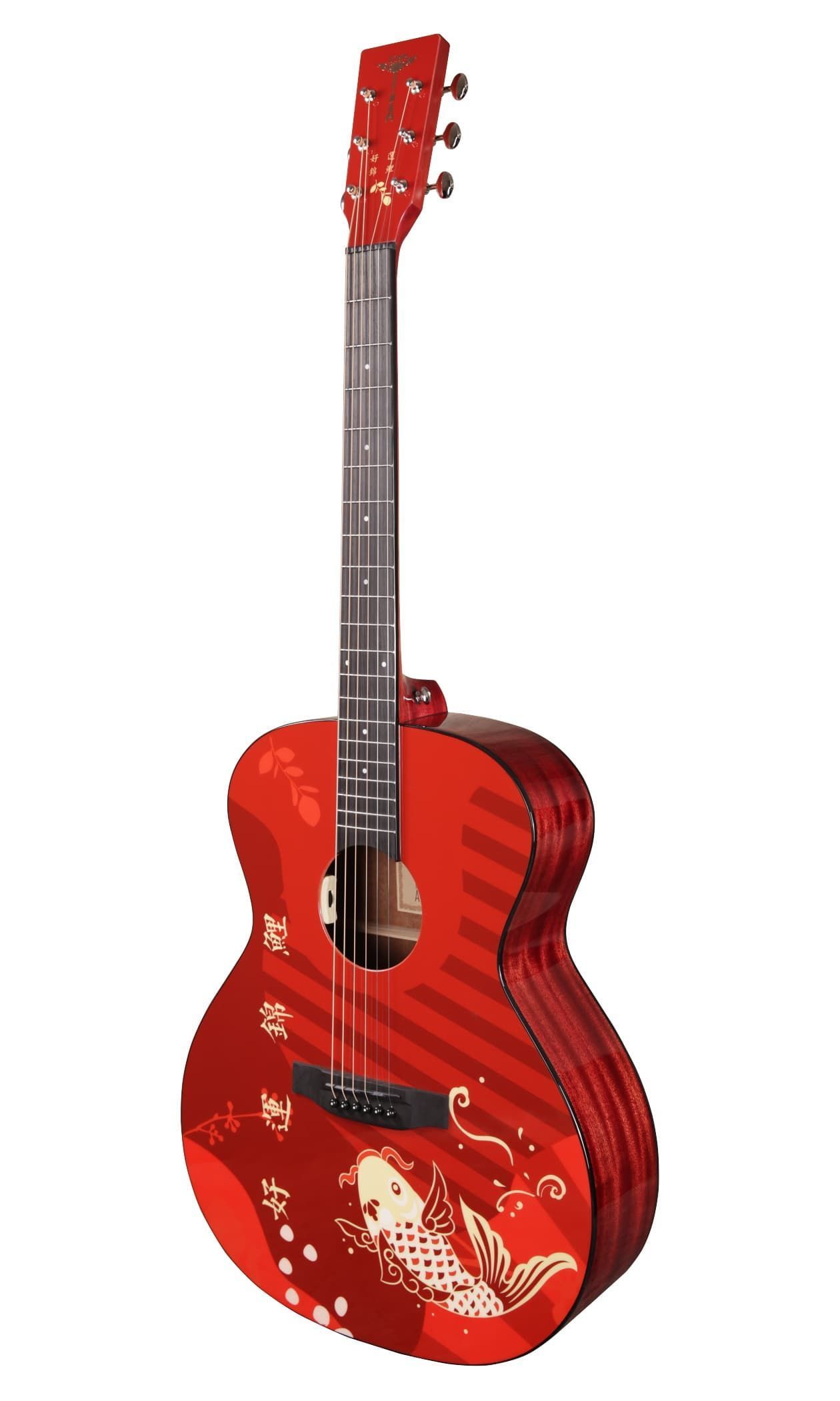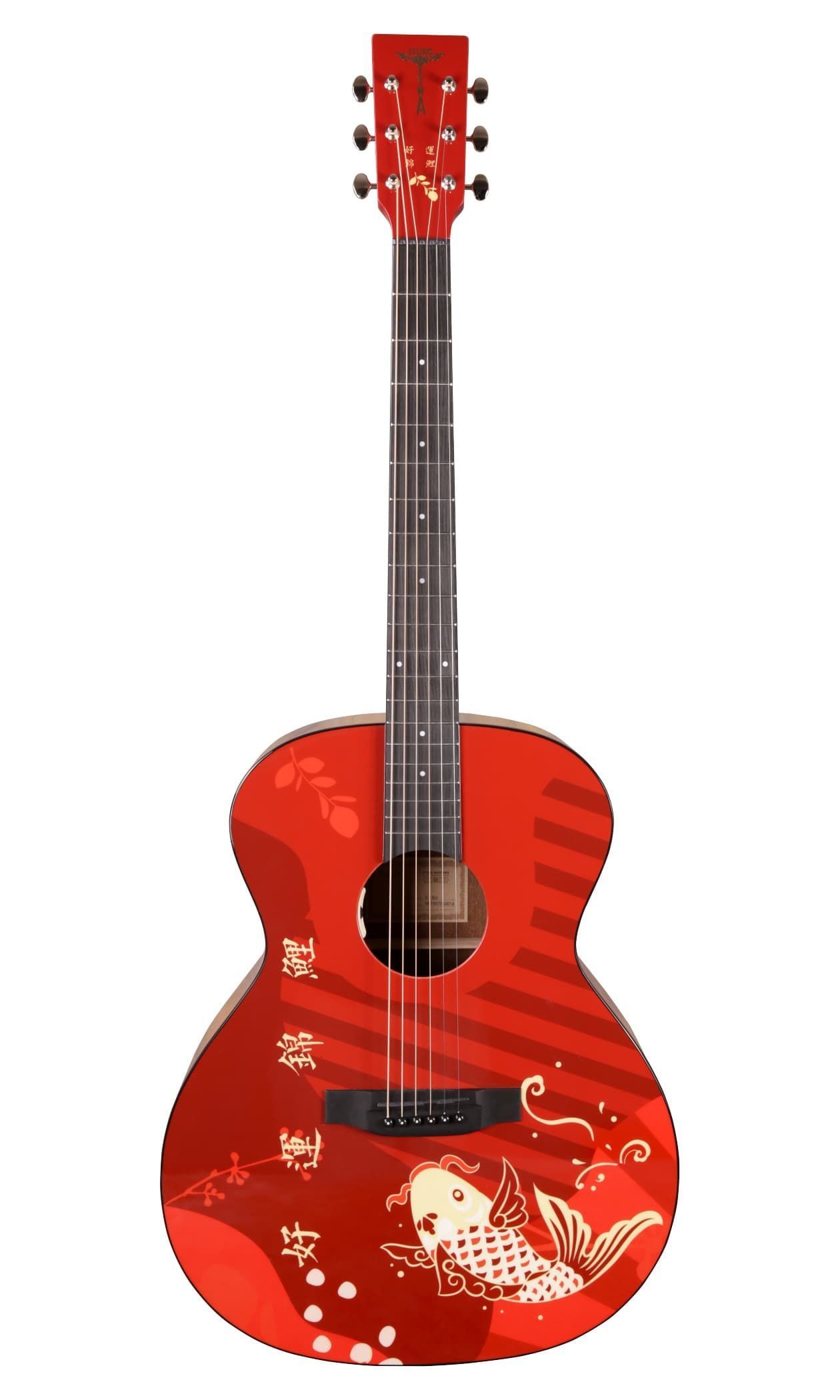 Електроакустична гітара. Форма - гранд аудиторіум. Топ - цільній, ситхінська ялина. Задня дека та боковини - махагон. Гриф - африканський махагон. Брідж та накладка на гриф - штучний ебоні. Фініш - червоний принт з рибкою. Електроніка - TYMA T-50. В комплекті - фірмовий гітарний чохол, ганчірка, ремінь.