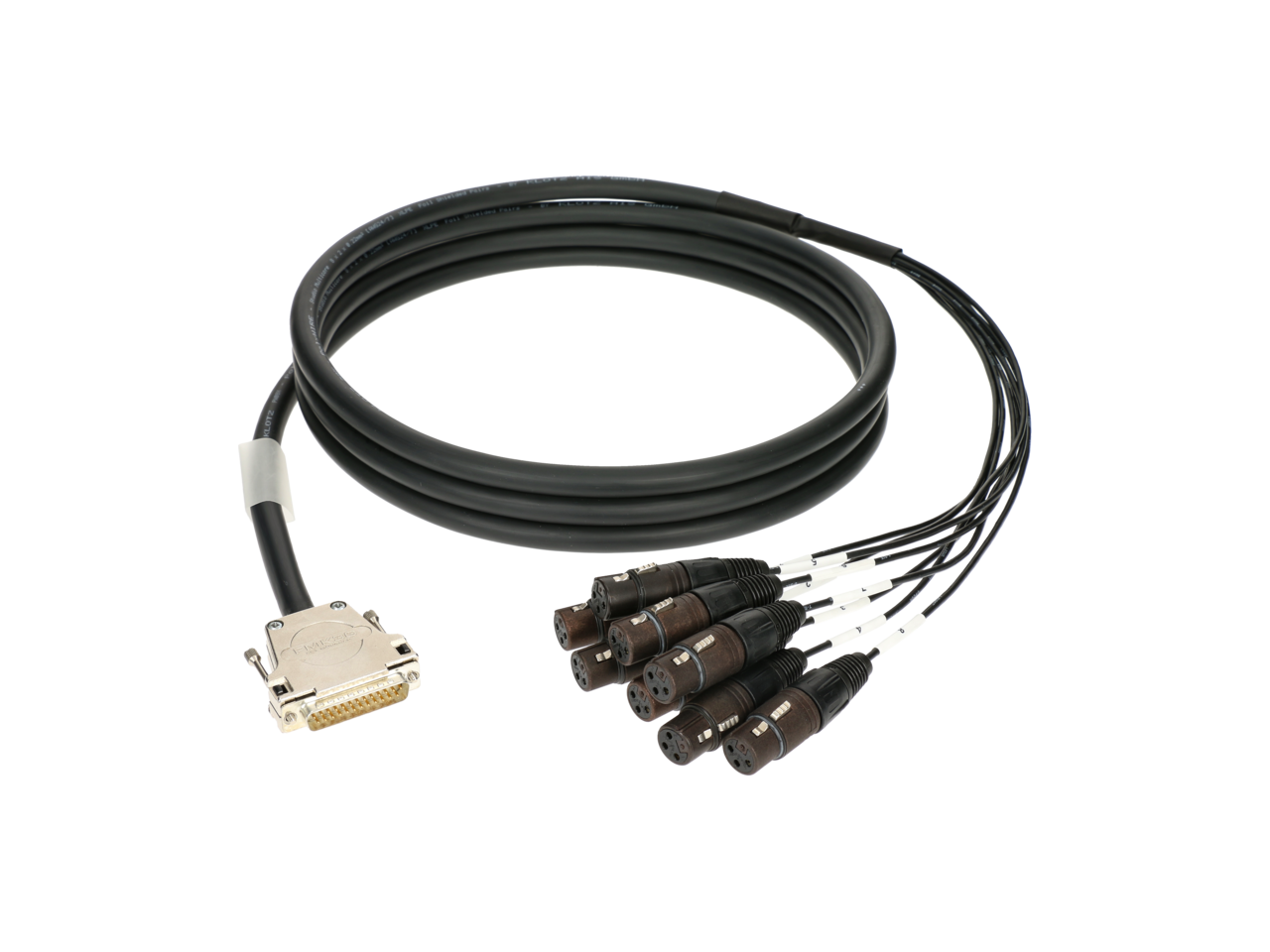 8-канальний аналоговий мультикор, DB-25 (D-Sub 25p male) <> 8 x XLR female (Neutrik), довжина 5 м., кабель PolyWIRE 0.22 мм² з низькою ємністю 85 пФ/м для найвищої якості аудіо, позолочені контакти DB-25, срібні контакти XLR, розпіновка за стандартом AES59 (Tascam DA88), індивідуальні канали захищені міцним вогнетривким плетеним обплетенням, прозорі термоусадочні трубки на обох кінцях для маркування, гвинтове з’єднання UNC 4-40 та M 2.5, сумісний з TASCAM, YAMAHA, MACKIE, Digidesign та Focusrite.