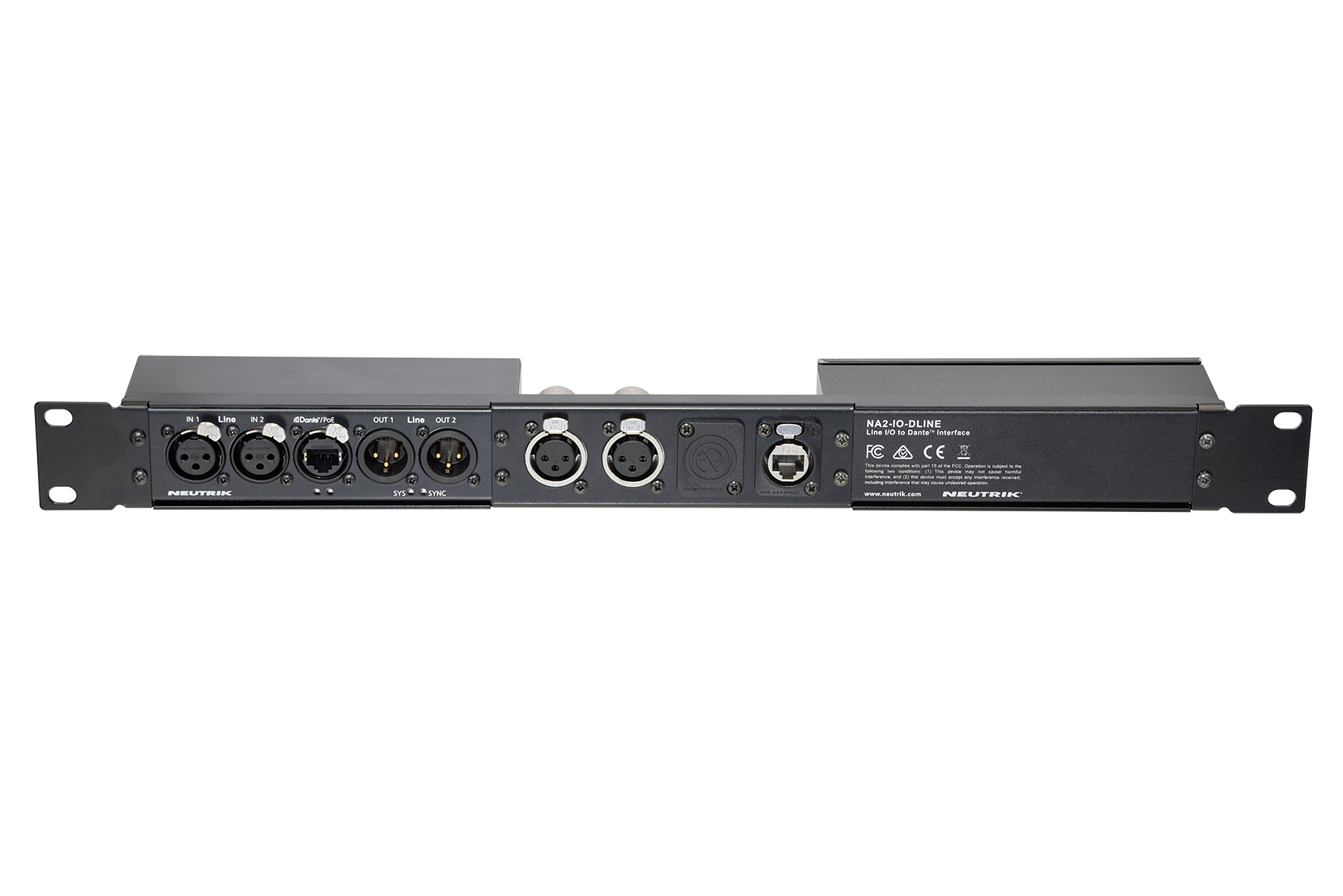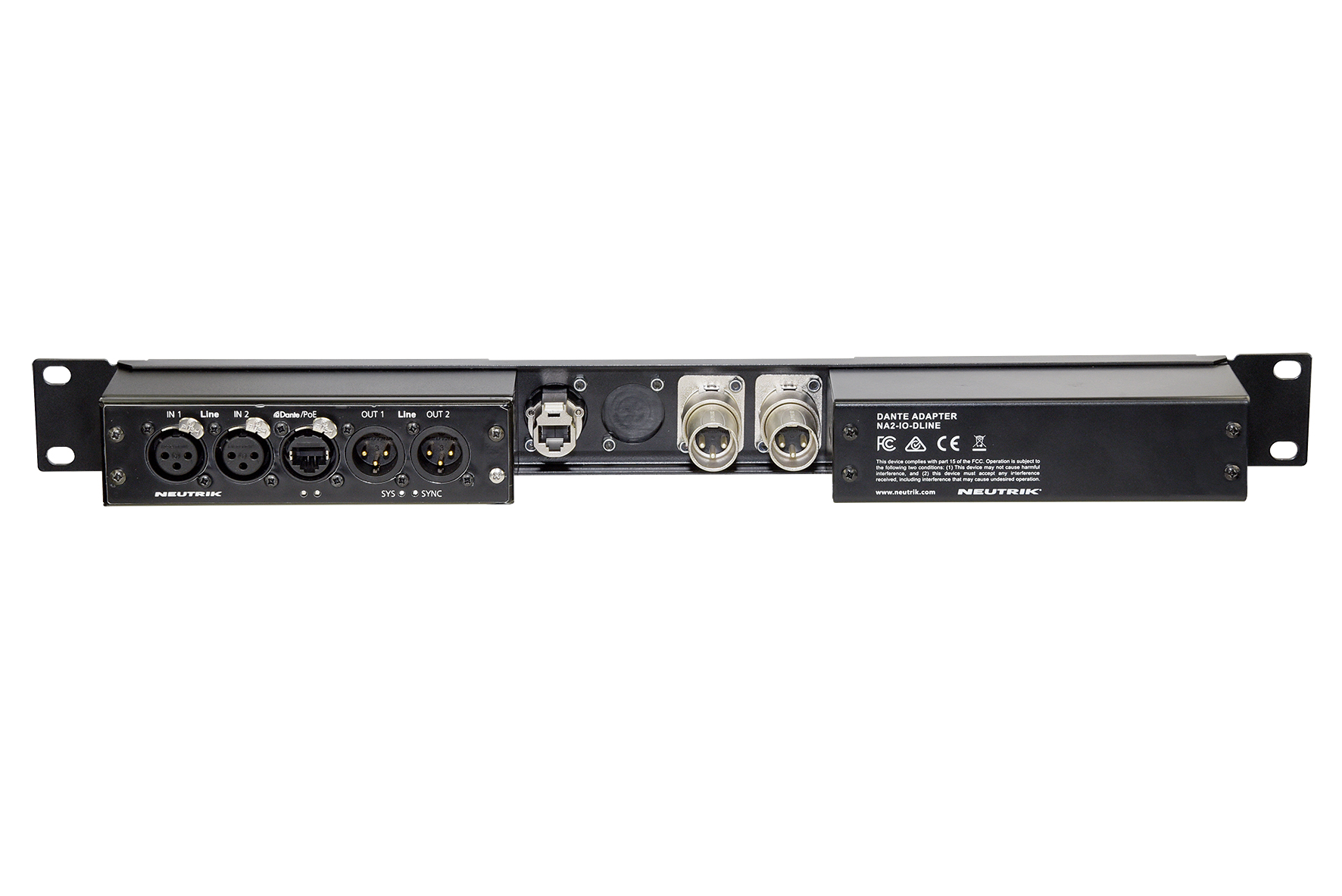 Панель висотою 1RU для монтування двох інтерфейсів NA2-IO-DLINE, NA2-IO-DPRO або NPS-30W в рековий стійці. 4 додаткових отвори дозволяють монтувати панельні аудіо або мережеві вводи типу D. NA2-IO-DLINE може бути змонтований в раму з обох сторін.