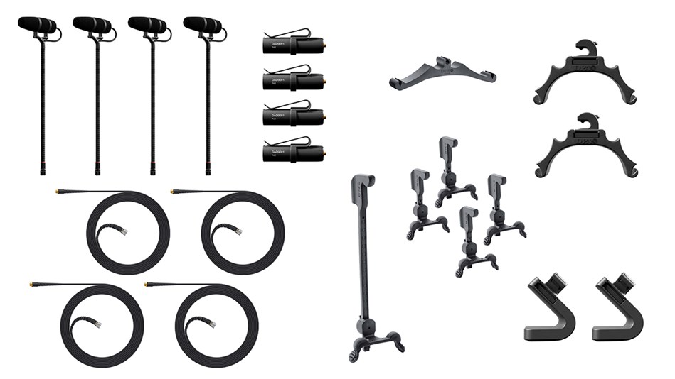 Комплект із чотирьох інструментальних мікрофонів DPA 4099 для живих виступів та студійного використання. Усі мікрофони мають суперкардіоїдну характеристику спрямованості, попередньо поляризовану конденсаторну капсулу та високий запас динамічного діапазону. Забезпечують природну передачу звуку без спотворень навіть при рівнях тиску до 145 dB SPL. До комплекту входить: 4 × Core 4099 Instrument Microphone, 4 × MicroDot адаптери, 4 × Кабелі Heavy Duty, 4 × Кріплення для барабанів (Drum Clip), 2 × Кріплення для саксофона/труби (STC4099 Clip), 2 × Універсальні кріплення (U-Clip), 1 × Жорсткий кейс Peli Case. Основні характеристики мікрофону: Тип: Pre-polarized condenser; Спрямованість: Supercardioid; Частотний діапазон: 20 Hz – 20 kHz; Ефективна частотна характеристика: ±2 dB, 80 Hz – 17 kHz із підйомом 2 dB на 10–12 kHz; Чутливість: 6 mV/Pa; –44 dB re. 1 V/Pa; Еквівалентний рівень шуму: 23 dB(A) тип.; Макс. SPL: 145 dB peak (THD 10%); Динамічний діапазон: 118 dB тип.; Вихідний опір: 30–40 Ω (MicroDot), 100 Ω з ада