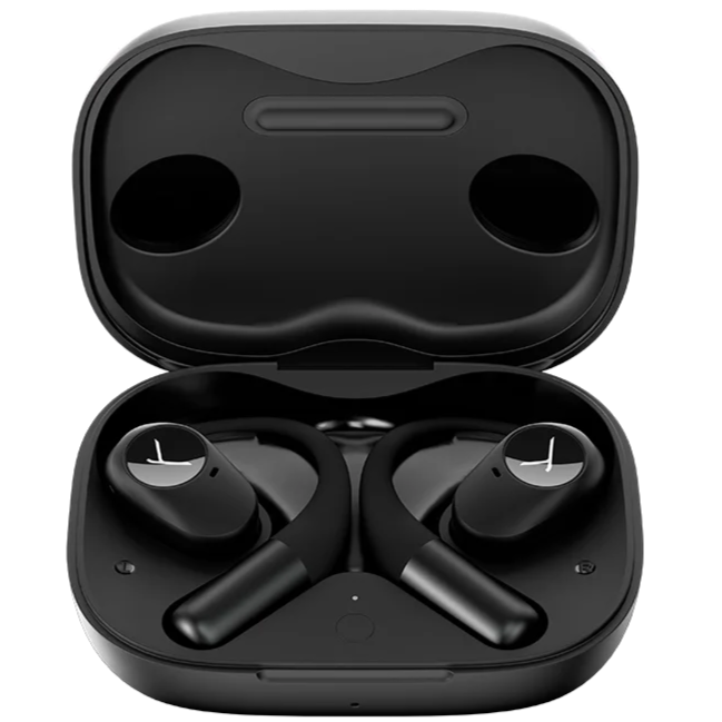 TWS гарнітура In-Ear відкритого типу з безпровідною технологією Bluetooth® 5.3. Дизайн конструкції забезпечує стабільну посадку без тиску на вуха, що ідеально підходить для бігу та активних занять. Ергономічні вушні зачепи та надлегка конструкція забезпечують надійну фіксацію та тривалий комфорт. Чіткі високі частоти, збалансовані середні та потужні баси, гарантує динамічне та детальне звучання. 11год звучання навушників після одного заряджання та 25год роботи від акумуляторів з додатковим заряджанням в футлярі. Захист від пилу та бризок класу IP54. Легкий контроль та керування усіх індивідуальних налаштувань в фірмовому додатку. Частотний діапазон: 20 – 20000 Гц. Дальність прийому: до 15м. Підтримка профілів Bluetooth®: HFP, A2DP, AVRCP. Кодеки: SBC, AAC. Комплектація: навушники, USB-С кабель, зарядний футляр. Колір – чорний