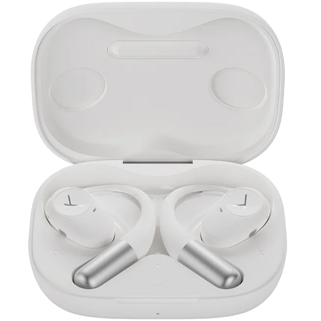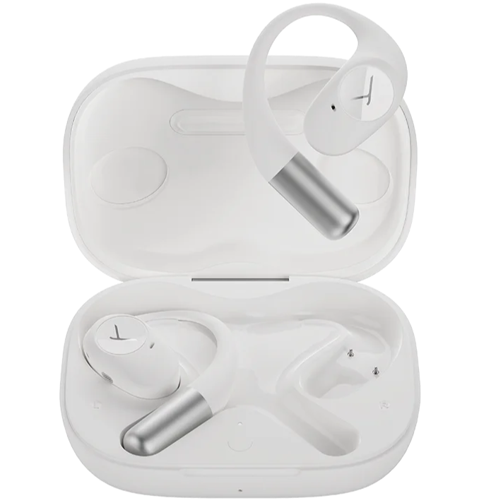 TWS гарнітура In-Ear відкритого типу з безпровідною технологією Bluetooth® 5.3. Дизайн конструкції забезпечує стабільну посадку без тиску на вуха, що ідеально підходить для бігу та активних занять. Ергономічні вушні зачепи та надлегка конструкція забезпечують надійну фіксацію та тривалий комфорт. Чіткі високі частоти, збалансовані середні та потужні баси, гарантує динамічне та детальне звучання. 11год звучання навушників після одного заряджання та 25год роботи від акумуляторів з додатковим заряджанням в футлярі. Захист від пилу та бризок класу IP54. Легкий контроль та керування усіх індивідуальних налаштувань в фірмовому додатку. Частотний діапазон: 20 – 20000 Гц. Дальність прийому: до 15м. Підтримка профілів Bluetooth®: HFP, A2DP, AVRCP. Кодеки: SBC, AAC. Комплектація: навушники, USB-С кабель, зарядний футляр. Колір – білий