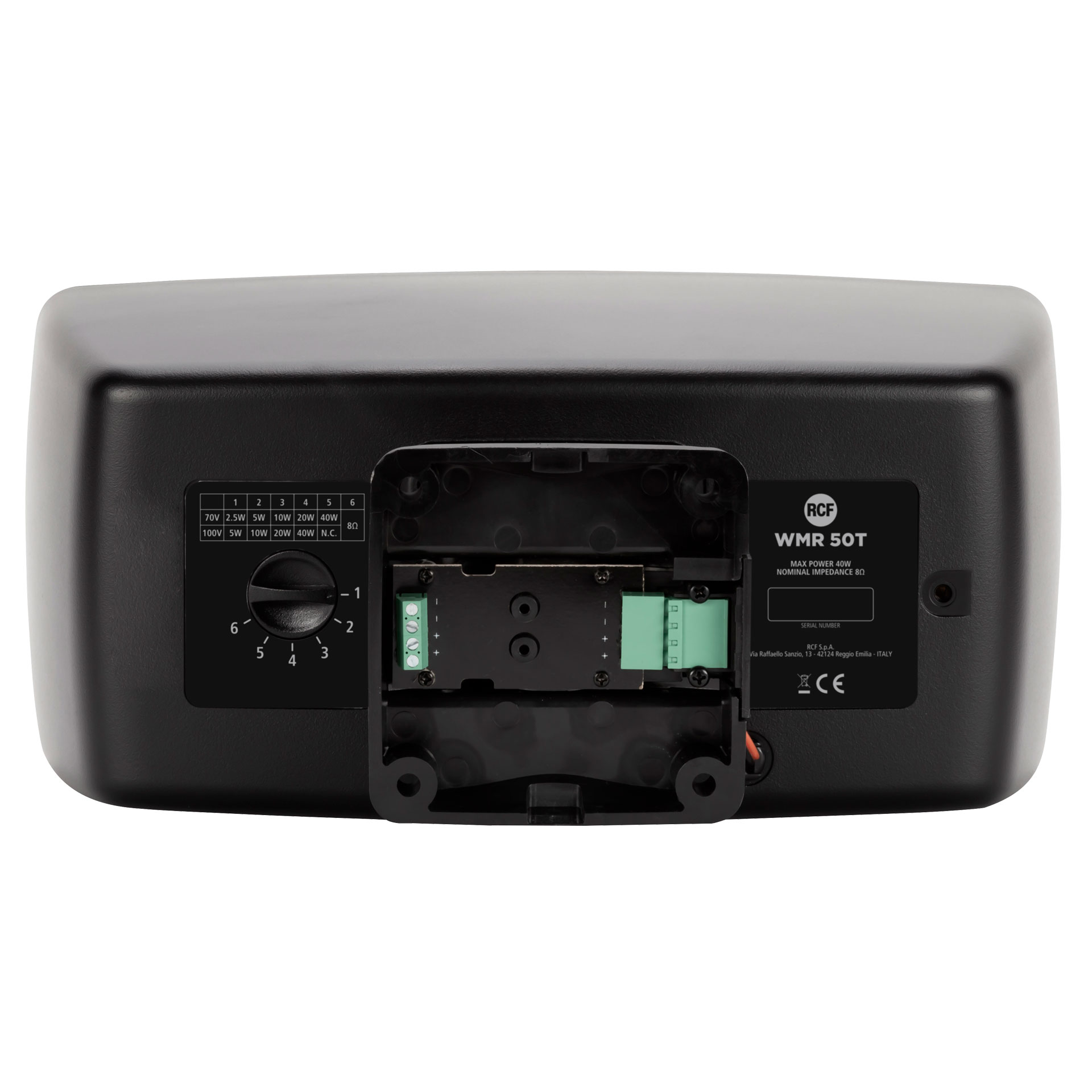 WMR 50T - багатоцільова двосмугова настінна акустична система для широкого спектру застосувань, Високоякісні перетворювачі гарантують точне відтворення музики в усьому діапазоні частот і забезпечують вражаючі рівні звукового тиску для такого компактного корпусу. Самозатухаючий пластиковий корпус і алюмінієва передня решітка. З’єднувальна плата вбудована в настінну опору. 4-полюсний роз'єм EUROBLOCK (аудіовхід і вихід паралельного зв'язку). 5" НЧ + 1"ВЧ (неодимовий купольний твітер), Потужність: 40 Вт (RMS). -Максимальний рівень звукового тиску: 110 дБ. -Частотний діапазон: 80-20000 Гц. -Кут охоплення: 140° x 100°, -Ступінь захисту: IP 55. -Колір: чорний RAL 9005