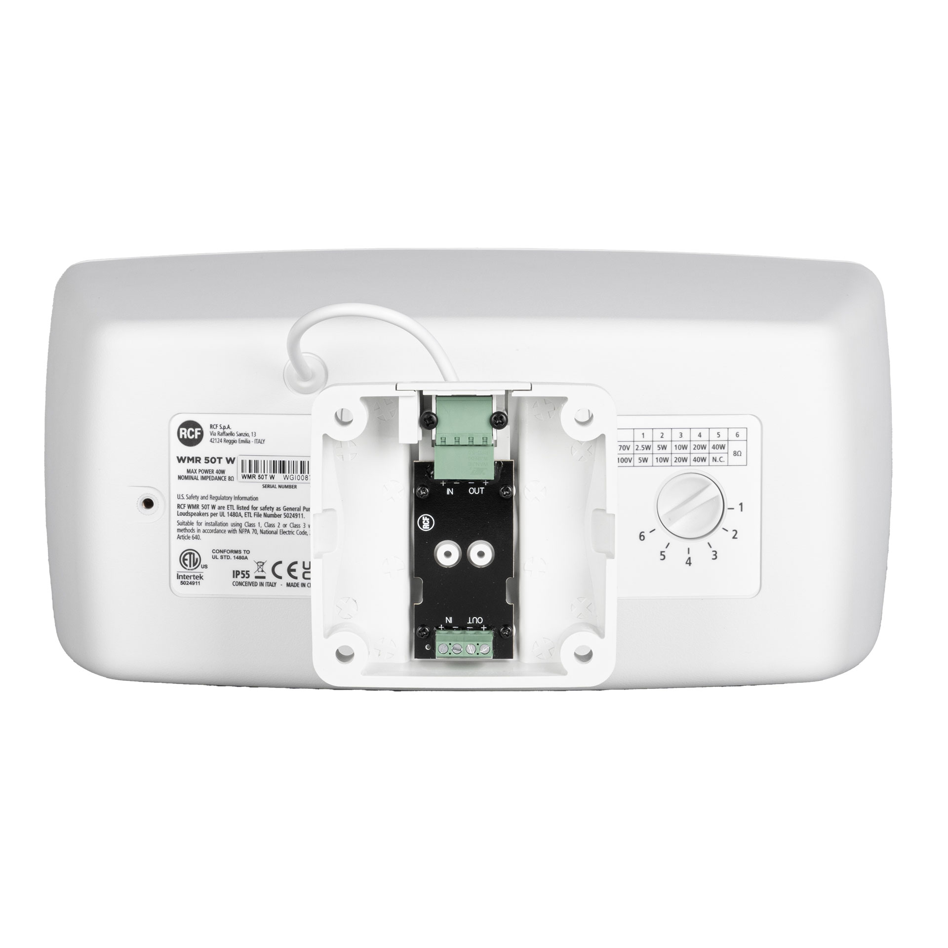WMR 50T W - багатоцільова двосмугова настінна акустична система для широкого спектру застосувань, Високоякісні перетворювачі гарантують точне відтворення музики в усьому діапазоні частот і забезпечують вражаючі рівні звукового тиску для такого компактного корпусу. Самозатухаючий пластиковий корпус і алюмінієва передня решітка. З’єднувальна плата вбудована в настінну опору. 4-полюсний роз'єм EUROBLOCK (аудіовхід і вихід паралельного зв'язку). 5" НЧ + 1"ВЧ (неодимовий купольний твітер), Потужність: 40 Вт (RMS). -Максимальний рівень звукового тиску: 110 дБ. -Частотний діапазон: 80-20000 Гц. -Кут охоплення: 140° x 100°, -Ступінь захисту: IP 55. -Колір: білий RAL 9003