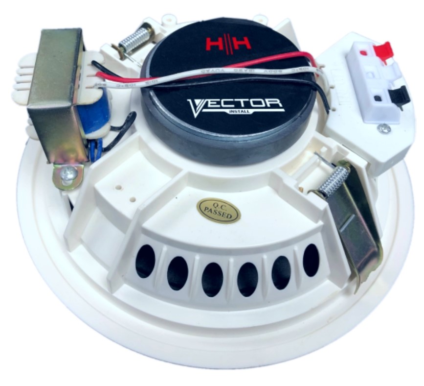 Широкосмугова стельова акустична система 6", Потужність при 100V - 3W, 6W, SPL макс. (PEAK @1 м) - 101 дБ, діапазон - 130 Гц — 18 кГц, кут розкриття 180°, вхідний роз’єм - пружинний затискач, зовнішній діаметр - 187 мм (7.4"), глибина 75 мм (3"), посадковий діаметр -165 мм (6.5"), хід затискачів - 4-20 мм, корпус з ABS пластика білого кольору, металева сітка, вага - 1 кг.
