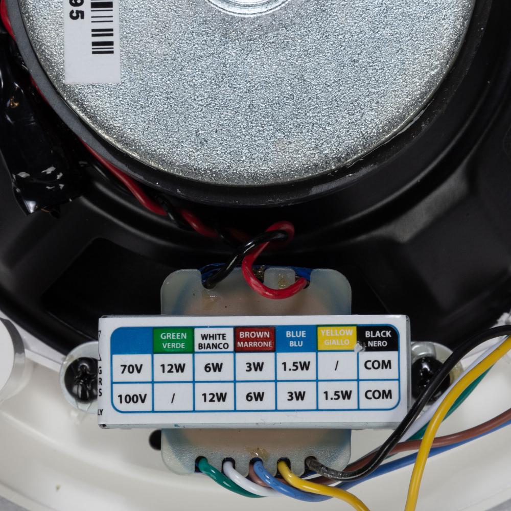 Вбудована стельова акустична система, 6" НЧ динамік та 1" купольний ВЧ твітер. (70/100 В): 12 Вт, 6 Вт, 3 Вт або 1.5 Вт, чутливість 92 дБ, максимальний рівень звукового тиску 106 дБ, частотний діапазон 70-20000 Гц, кут охоплення 100°. Колір білий RAL 9003