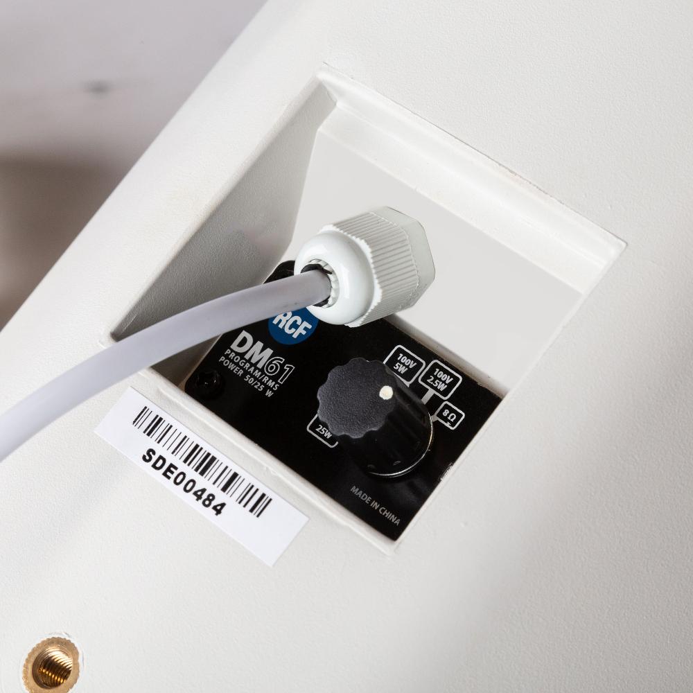 Двосмугова компактна акустична система, 6" НЧ + 1" ВЧ, 15 Вт, з лінійним трансформатором (вибір потужності (100 В): 25 Вт – 12,5 Вт – 7,5 Вт – 5 Вт – 2,5 Вт). Чутливість: 89 дБ, IP55, білий RAL 9002