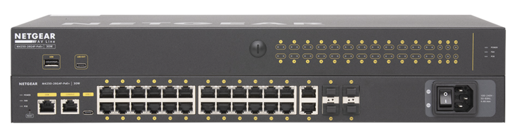 Мережевий світч, 10 портів. Сконфігуровані для системи Q-SYS Audio, Video та Control, 8 портів PoE++ (бюджет PoE 720 Вт). Підтримка QoS та IGMP відповідно до стандарту AES67 і Dante в одній локальній мережі (VLAN).
