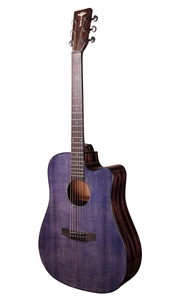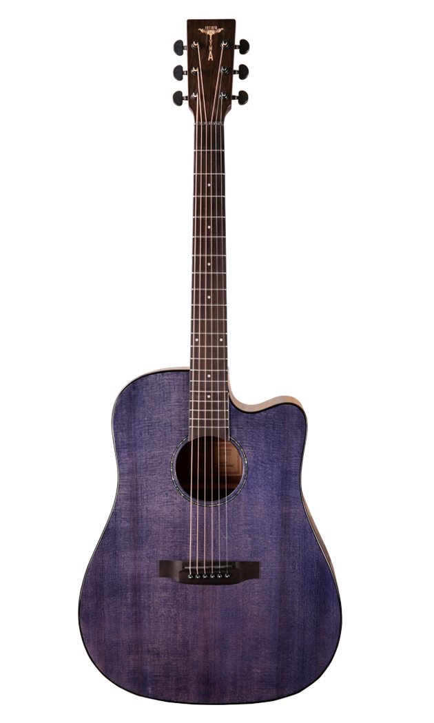 Електро акустична гітара. Тип корпусу: Dreadnaught Cutaway Верхня дека: Масив Ситхінська ялина Боковини і нижня дека: Червоне дерево Гриф: Червона дерево Брідж: Палісандр Накладка на гриф: Палісандр Ширина поріжка: 43 мм Механіка: хромовані Diecast Кількість ладів: 20 Мензура: 645 мм Електроніка: TYMA T200 Покриття: Глянцеве Колір: Фіолетовий прозорий. Чохол в комплекті.