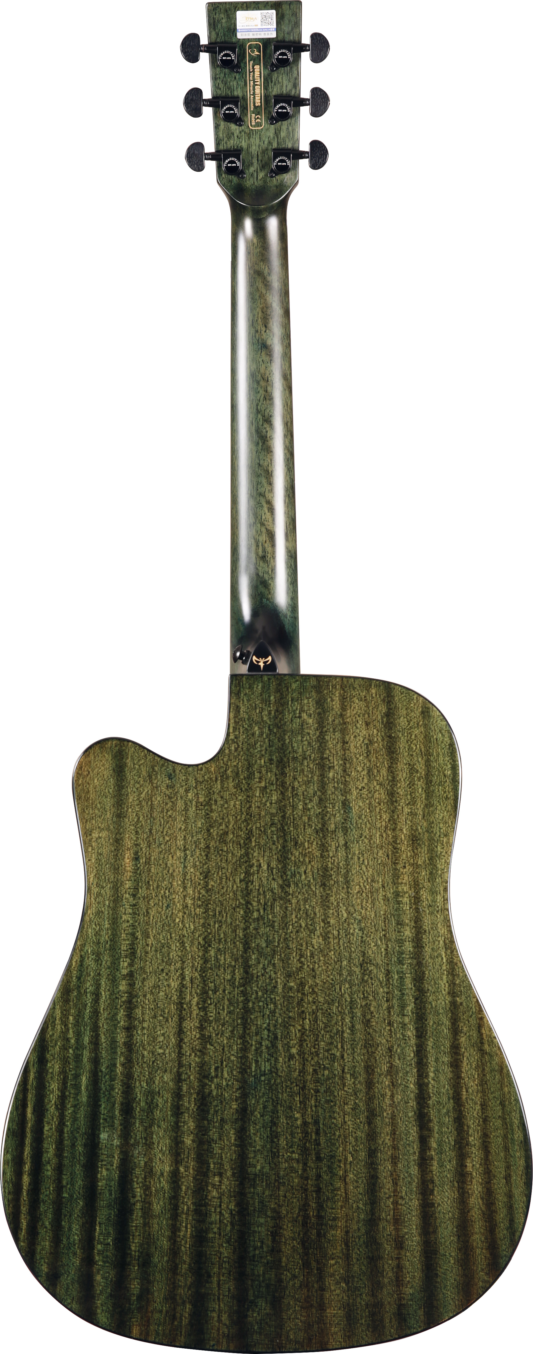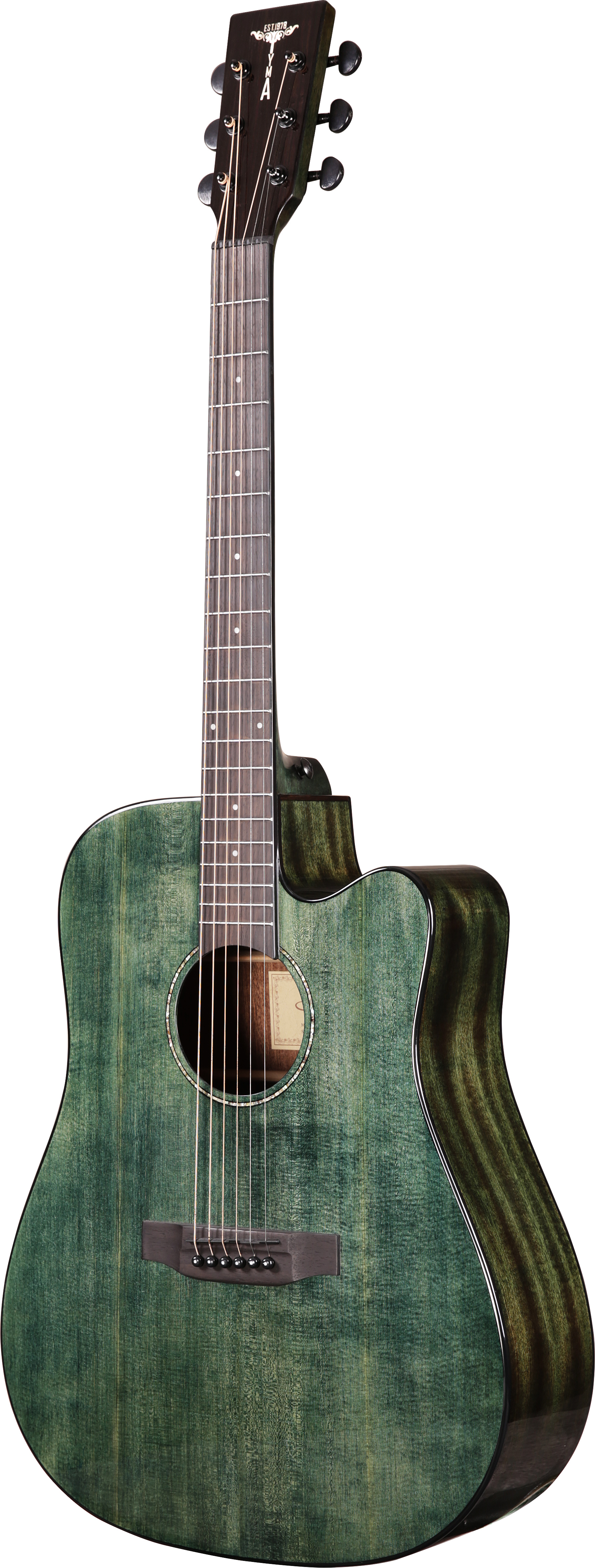 Електро акустична гітара. Тип корпусу: Dreadnaught Cutaway Верхня дека: Масив Ситхінська ялина Боковини і нижня дека: Червоне дерево Гриф: Червона дерево Брідж: Палісандр Накладка на гриф: Палісандр Ширина поріжка: 43 мм Механіка: хромовані Diecast Кількість ладів: 20 Мензура: 645 мм Електроніка: TYMA T200 Покриття: Глянцеве Колір: Зелений прозорий. Чохол в комплекті.