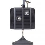 sE Electronics guitaRF- Мікрофонний екран-стійка для звукозапису інструментів, кріплення для двох мікрофонів, підлогова стійка в комплекті, можливість кріпити на будь-яку мікрофонну стійку. sE Electronics guitaRF - діє як фільтр відображень, ізолятор, подвійна мікрофонна стійка і утримувач для двох мікрофонів: конденсаторного з великою діафрагмою або стрічкового і динамічного або мікрофона з маленькою капсулою. Плюс це все в одному пристрій здатний ідеально вирівнювати фазу двох капсул для досягнення максимальної віддачі. Кріплення guitaRF регулюються в трьох осях - по вертикалі, глибині і горизонталі, тим самим Ви зможете знайти ідеальне розташування для будь-якого мікрофона. Сам фільтр і мікрофонний комплекс також може рухатися вгору і вниз для точного розташування мікрофону під конусом динаміка або якщо потрібно, фільтр можна зняти з підстави і встановити його на будь-яку мікрофонну стійку. На задній панелі фільтра так ее можна знайти зручне кріплення для мікрофонних кабелів.