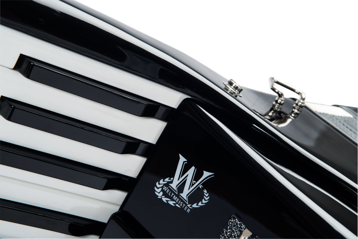 Weltmeister Cassotto 374 37/96/4/11/5 338 688 грн. (немає) Weltmeister Cassotto 374 37/96/4/11/5 - професійний акордеон, який має більш легкий корпус ніж інші інструменти цього класу. При цьому він також оснащений ламаною декою. Клавіш в правій руці: 37, кнопок в лівій клавіатурі: 96, ліві регістри: 5, голоси дискант: IV, голоси бас: IV, регістри дискант: 11, регістри бас: 5, діапазон дискант: f - f '' ', діапазон бас: E - d' '#, італійські пластини, захист хутра, розміри: 442 х 192, вага: 10,4 кг.