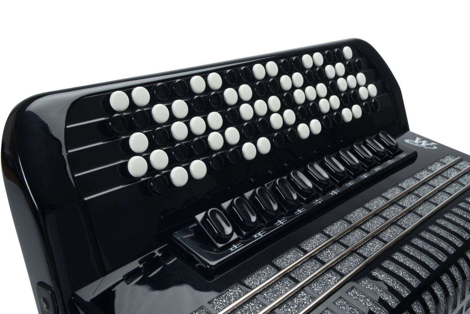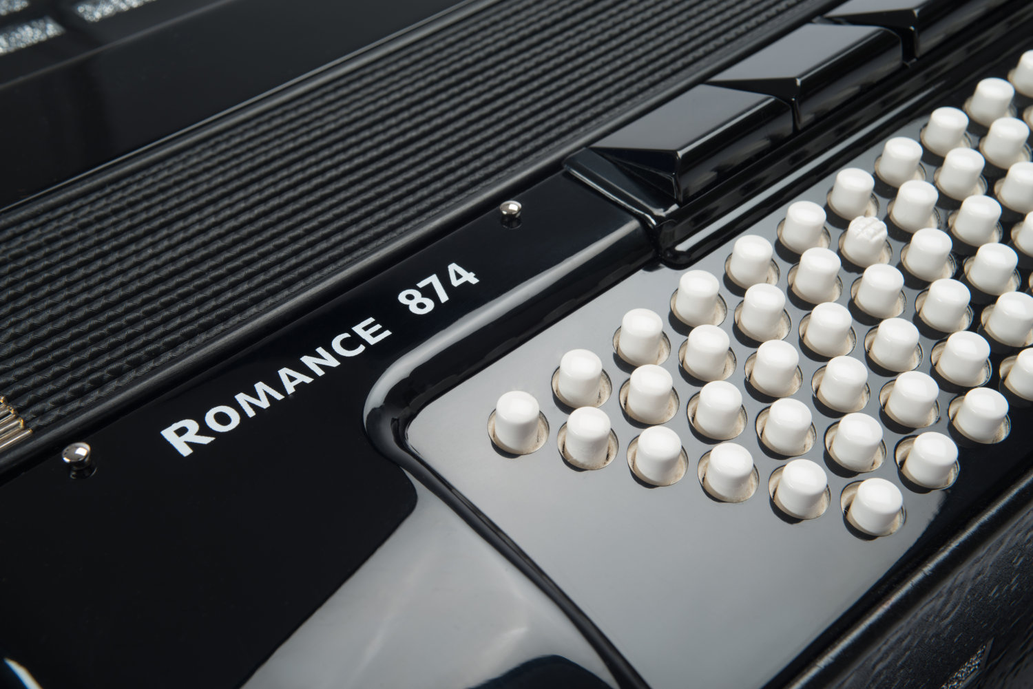 Weltmeister Romance 874 87/120/4/11/5 - найбільший баян в колекції бренду, його п'ятирядна клавіатура сприяє збалансованій і комфортній грі. Ліва клавіатура: 120 кнопок, права клавіатура: 87 кнопок, IV голоси дискант з 11 регістрами, IV голоси бас з 5 регістрами, діапазон дискант: c # - c # '' '', діапазон бас: E - d # '', дерев'яні італійські пластини ручної роботи, захист хутра, розміри: 482 х 192, вага: 11,3 кг.