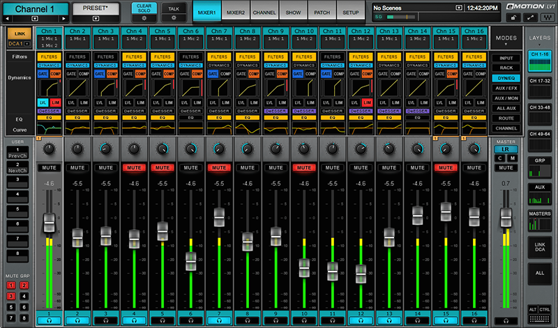 Програмний мікшер eMotion 64 стерео каналу, eMo D5 плагіни (comp, gate, expander, leveler, limiter, desser)