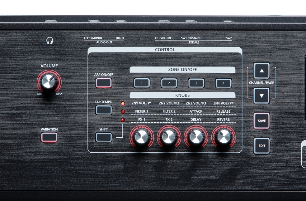 Сценічне піано. 76 напівзважених клавіш, чутливих до сили натискання (SWA76). 128 голосів поліфонії, 16-приватна мультітембральность. Архітектура: VAST, KB3, VA1. Нашарування тембрів і розділення клавіатури. Заводські програми: 256, призначені для користувача програми: 1024, заводські Мульти: 130, призначені для користувача Мульти: 1024. Категорія «Favorites»: 5 осередків. Функція струнного резонансу і шуму демпфера. Ефекти: сотні комплексних ланцюгів ефектів, включаючи: reverbs, delays, chorus, flange, phaser, EQs, distortions, rotary speaker simulators, compressors і інші. Арпеджиатор: 1 на програму, 4 на Мульти. Аналогові виходи: два ¼ "балансних TRS аналогових (32-bit DACs). 1/4" вхід для підключення навушників. MIDI вхід, вихід. Два USB порту, повна MIDI функціональність по USB. Аксесуари в комплекті: кабель живлення, педаль, USB кабель, 4 самоклеючі ніжки. Висота: 10,78 см, глибина: 35,75 см, довжина: 119,2 см, вага: 7,95 кг, живлення: зовнішній блок 15VDC 2.5A